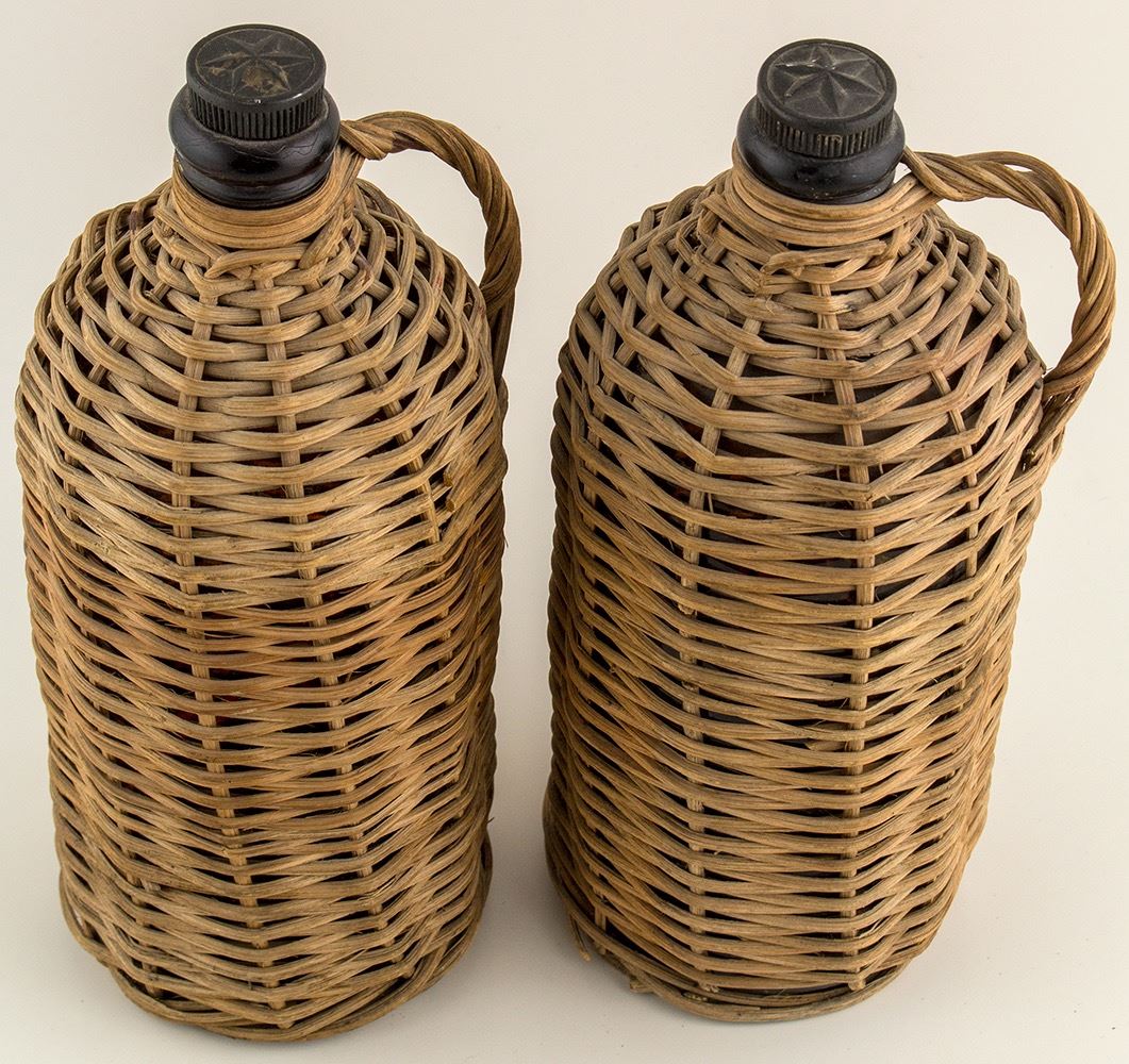 Pair of double roll inside screw amber whiskey bottles in wicker with handles. The amber bottles are the approximate size of the USA hospital bottles. The bottles are approximately 9.25" tall, and 3.75" in diameter. This is an unusual pair of early wicker whiskey bottles. From the Mortimer collection. City: State: Inventory Number: 38754