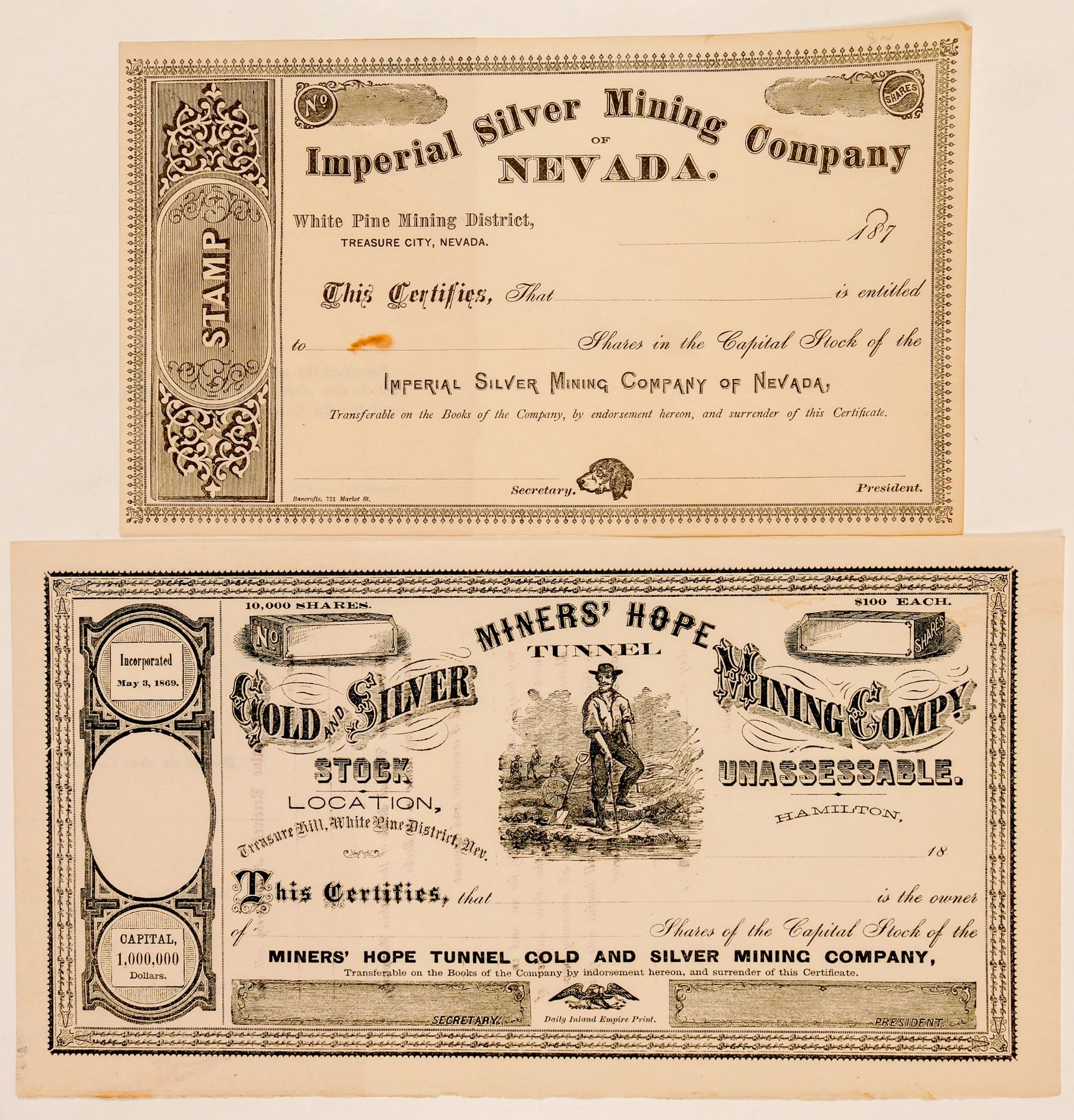 Lot of 2 different, both unissued. 1) Miners' Hope Gold & Silver Mining Company. Treasure Hill. Prospector vignette. 2) Imperial Silver Mining Company of Nevada. Treasure City. 1870s. () Ken Prag Collection