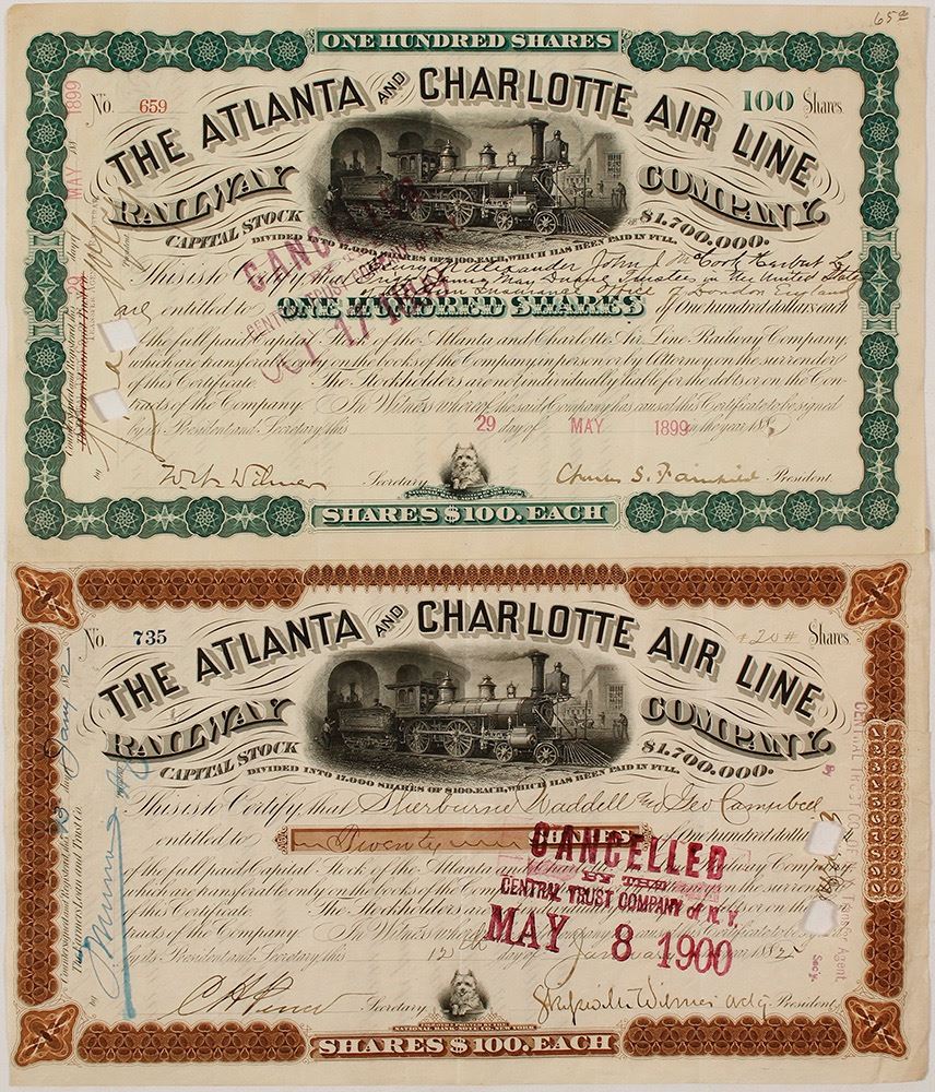 Same stock certificate, two decades apart in two different colors. 1) Brown. 1882. Number 735 fro 20 shares to Sherburne Waddell and George Campbell. Signed by CH Pierce(?) and S Winner(?). 2) Green. Number 659 for 100 shares to Henry M Alexander et al trustees in an insurance company. Both have heavy stamped and large diamond cancels. The Atlanta & Charlotte Air-Line Railway resulted from an 1877 reorganization of the Atlanta & Richmond Air-Line Railway. In 1881 the A&CAL was leased to the Richmond & Danville Railroad. In 1894, along with the R&D itself, it became a part of the Southern Railway. At the time, "Air-Line" referred to a direct route, or at least a route more direct than that of any competitor. (Al Adams Gold Rush Memorabilia Collection) Date: 1882, 1889 Location: Atlanta, Georgia HWAC# 58268
