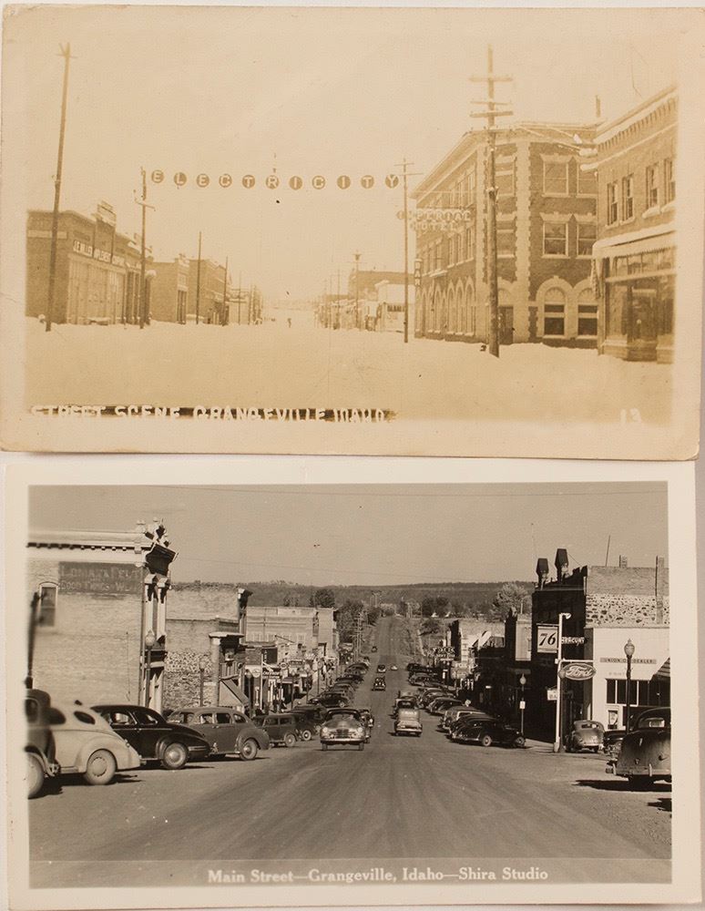 1) 1913 main street. Unique sign above the street says, "ELECTRICITY." Snow covers the ground. Mailed in August, but author says, "This is not today..." 2) Later main street photo by Shira Studio. 1947. Date: Location: Grangeville, Idaho HWAC # 54530
