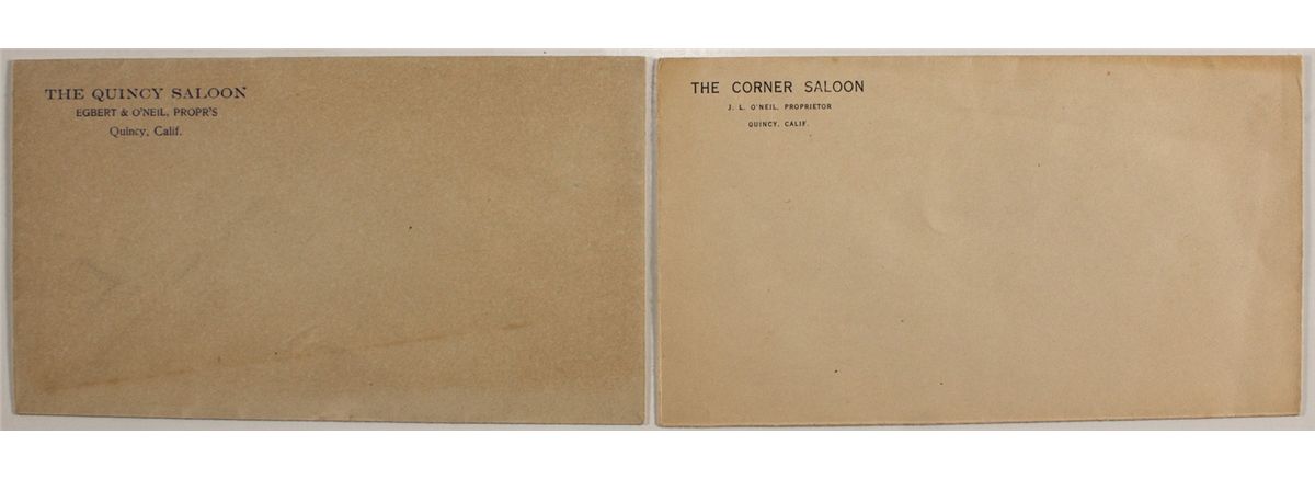 1) The Quincy Saloon, Egbert & O'Neal, propr's. 2) The Corner Saloon, J. L. O'Neal, proprietor. Both are unused and in excellent condition.City: QuincyCounty: PlumasState: CADate: