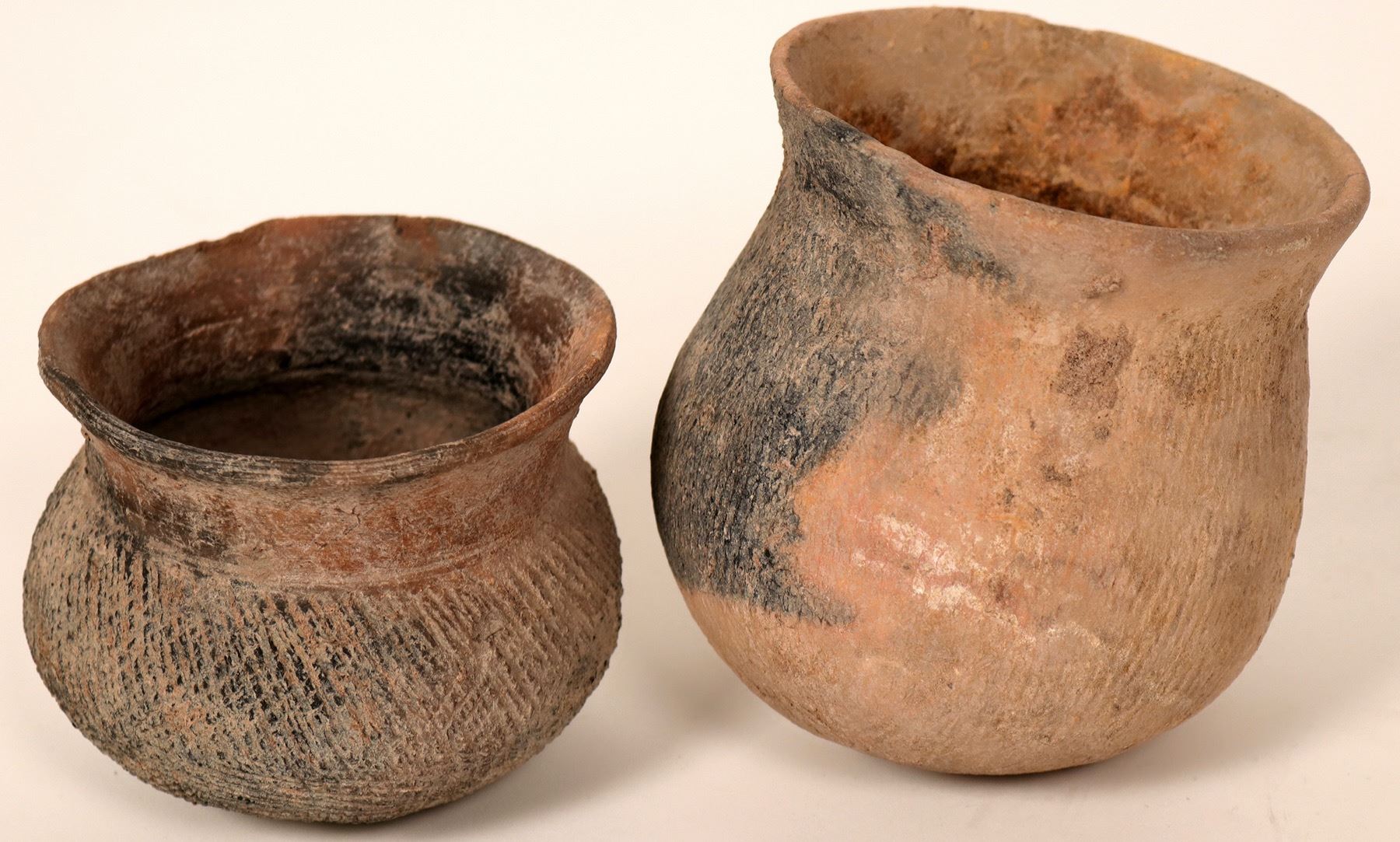 Two red clay jars from East Asia, China, Neolithic Period, ca. 3000 to 2000 BCE. Round bottomed vessels, the bodies covered in deeply-incised lines (sgraffito) which give them an interesting texture. The wide neck of the vessel is slightly corseted and flares upwards to a thick rim with a splayed lip. One jar is 4" h x 4.25" diameter; the other is 5"h x 4.75" diameter.