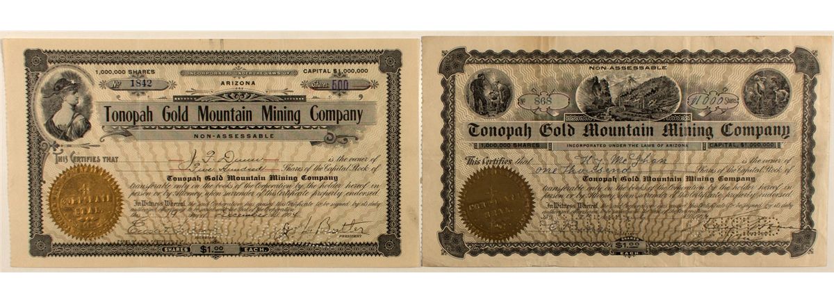 1) Tonopah Gold Mountain #868 for 1,000 shares in 1904. Signed by Vice President Key Pittman. Served in United States Senate from 1913 to 1940. 2) Tonopah Gold Mountain Mining Company #1842 for 500 shares in 1904. Signed by president Jim Butler. Tonopah began circa 1900 with the discovery of gold and silver-rich ore by prospector Jim Butler when he went looking for a lost burro he owned. The burro had wandered off during the night and sought shelter near a rock outcropping. When Butler discovered the animal the next morning, he picked up a rock to throw at the beast, but instead noticed the rock was unusually heavy. He had stumbled upon the second-richest silver strike in Nevada history. Tonopah was originally called Butler, Nevada.City: TonopahCounty: NyeState: NVDate: