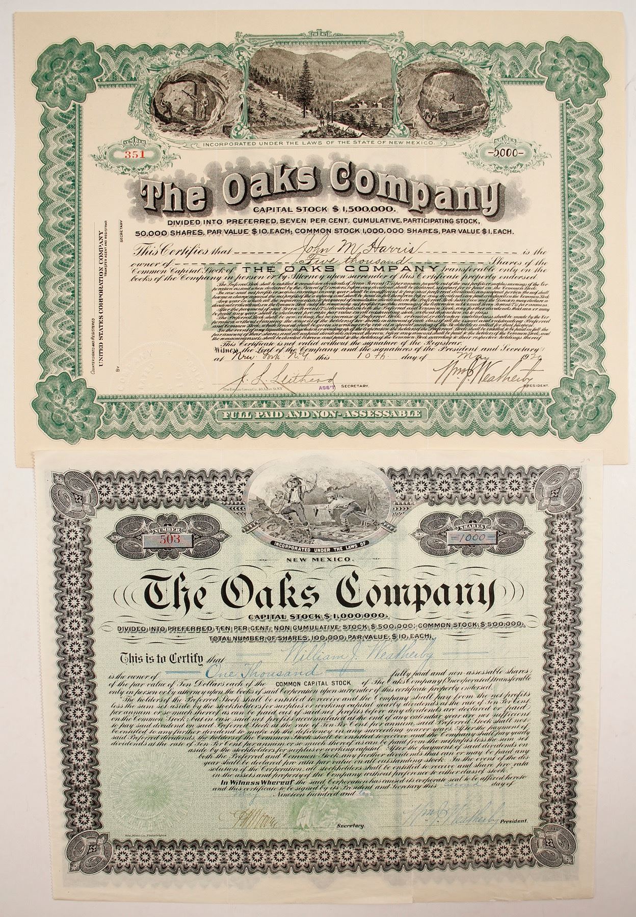 Two capital stock certificates from Oaks Company. 1) One thousand shares, number 503, assigned to William J. Weatherby, signed by William J. Weatherby, president on May 2, 1910. One vignette of working miners. Printed by Wm. Mann Co., Philadelphia. 2) Five thousand shares, number 351, assigned to John M. Harris, signed by William J. Weatherby, president on May 10, 1920. Three vignettes with two of working miners and one of the area outside mine. Ken . Ken Prag Collection