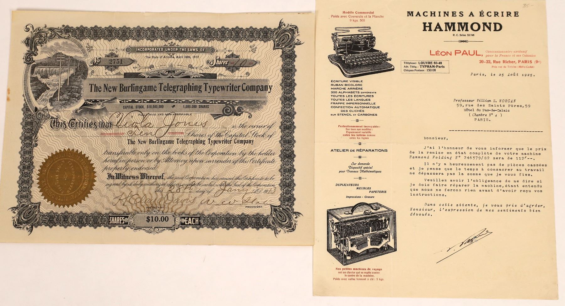 Lot of 2. 1) The New Burlingame Telegraphing Typewriter Company. Inc. in Arizona. Issued in 1913, not cancelled. Vignette of telegraph lines. 2) Pictorial letterhead for a French company. Machines A Ecrire Hammond, 1925. Two typewriter vignettes.