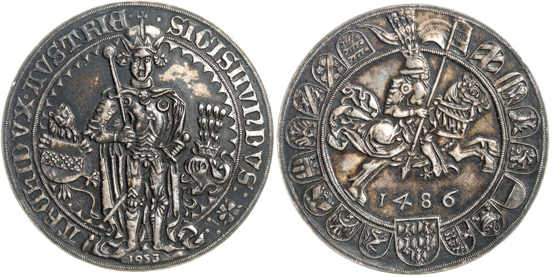 1953 Vienna Mint restrike of the famous 1486 Tyrol Thaler. 5,000 total were struck in 900 fine silver. This antiqued example of the forerunner of our own silver dollars is always a popular piece.