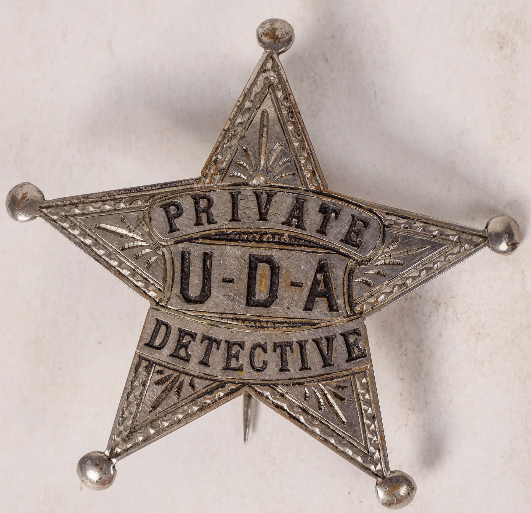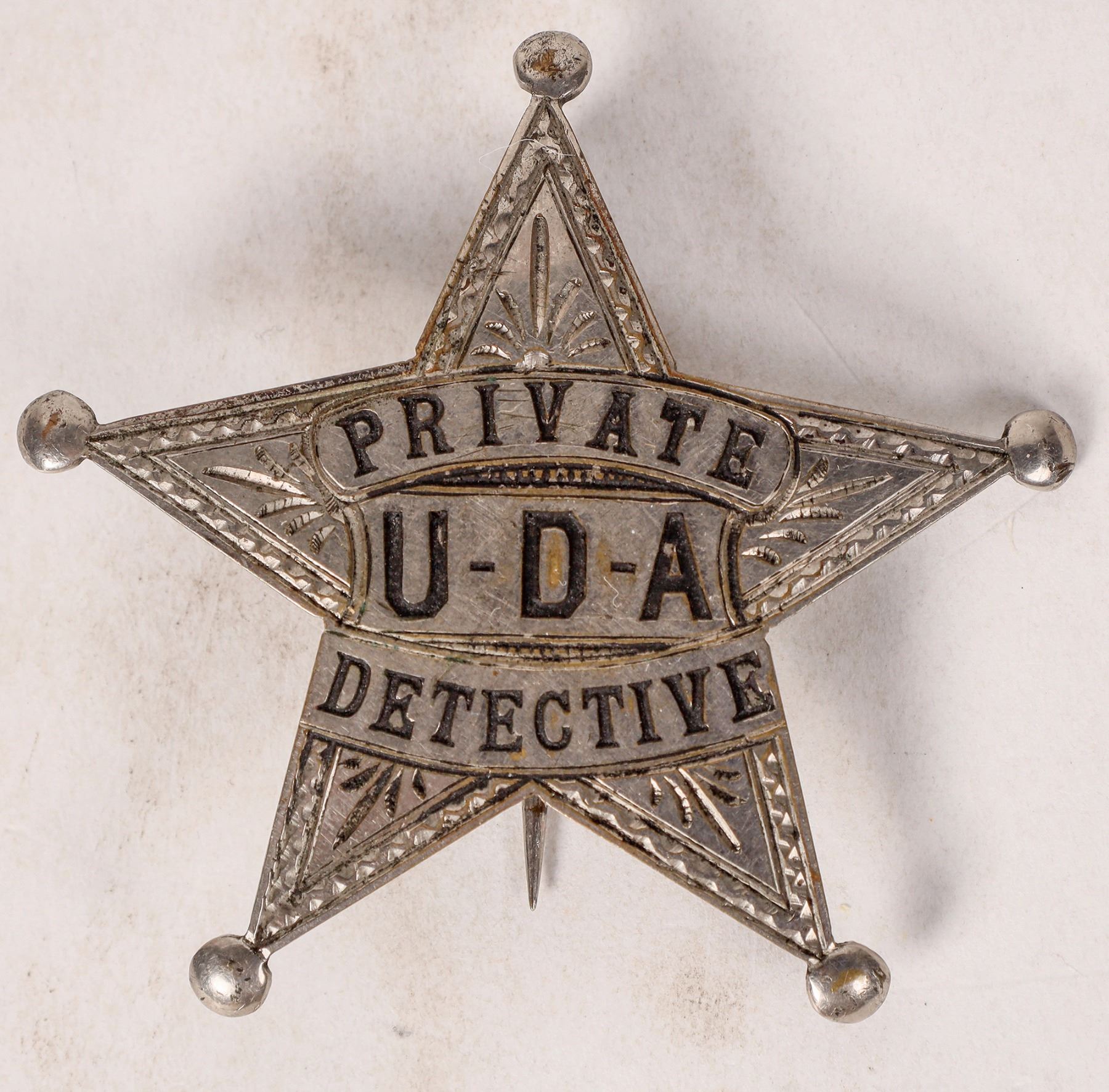 Silver plated U-D-A Private Detective 5 point star badge. Likely United Detective Agency. 2.25" with pinback.