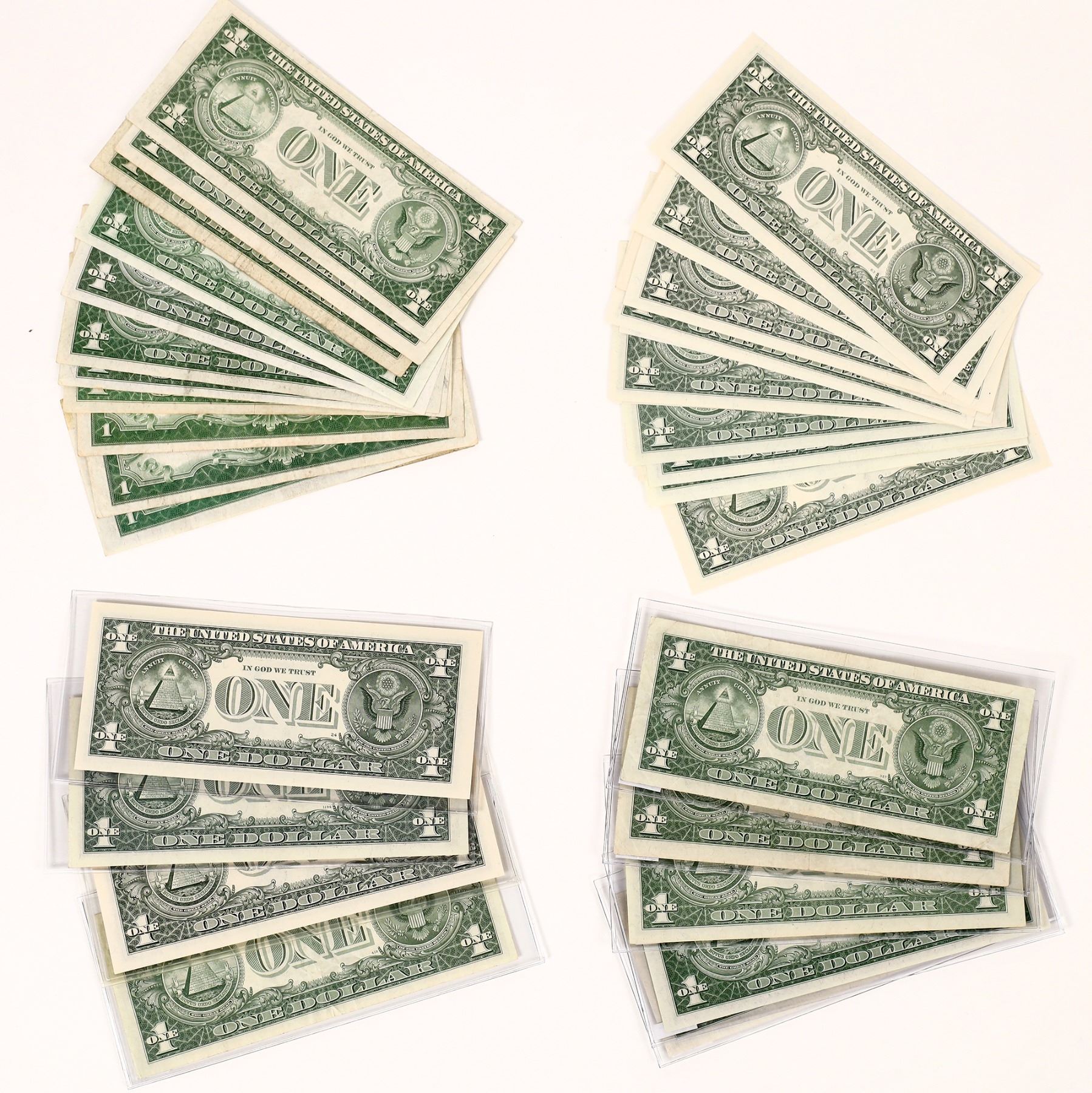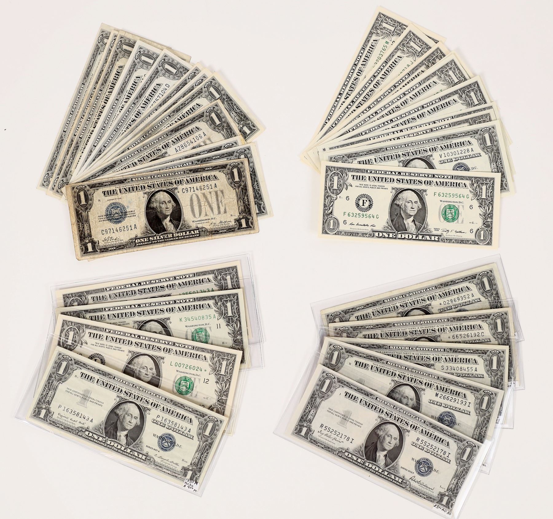 Thirty five different one dollar bills. Sixteen silver certificates from 1928-1957. Modern notes (many crisp uncirculated) from 1963-2009.