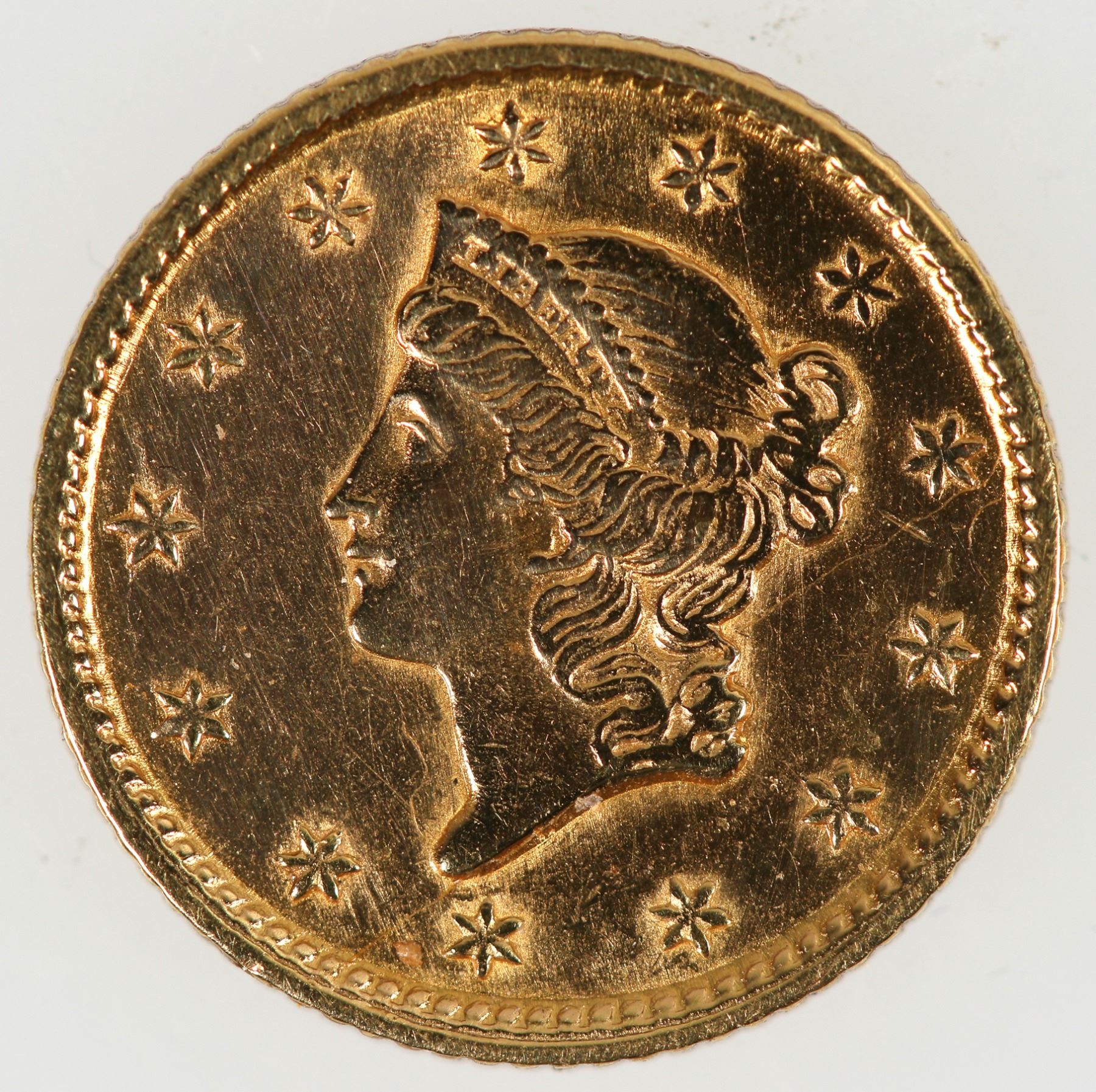 A Gift for Baby from Mildred and Frank Strawn, March, 28, 1941: May you be one in ten million to keep the first dollar you ever received. In a flowered little folding case is a 1853 Liberty Head $1 gold piece, (AU-BU condition). (net weight .04837 oz. pure gold). Mintage: 4,076,051.