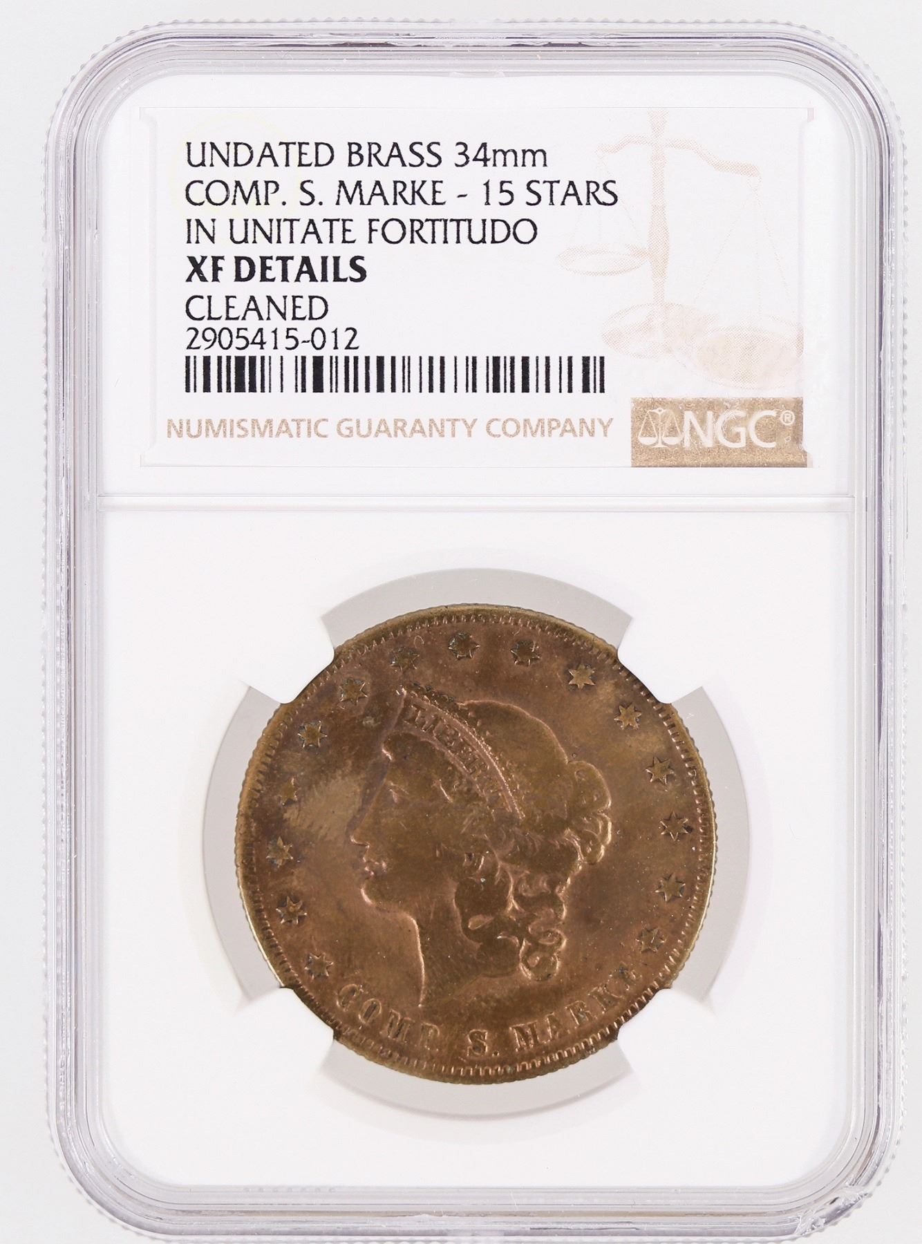 NGC certified SF Details, cleaned. Undated brass 34 mm comp spiel marke, 15 stars. "In Unitate Fortitudo" on reverse. How many times did this piece pass for a legit $20?