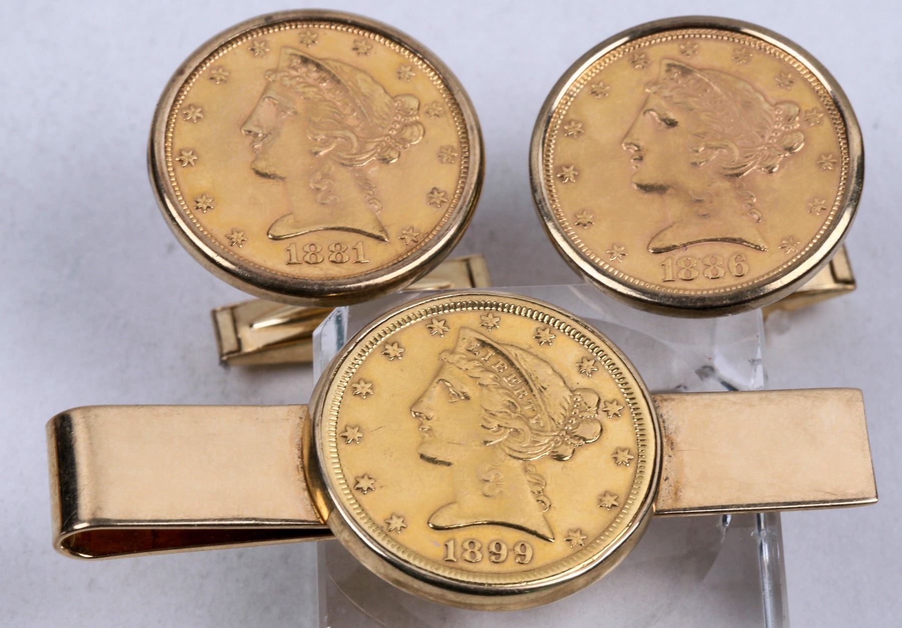 Three Liberty Head five dollar gold pieces fashioned into jewelry. The cuff links (each 12.5 grams) are 1881 and 1886-S in 14 carat gold. The tie bar (17.9 grams)is dated 1899, not marked but tests 14 carat.