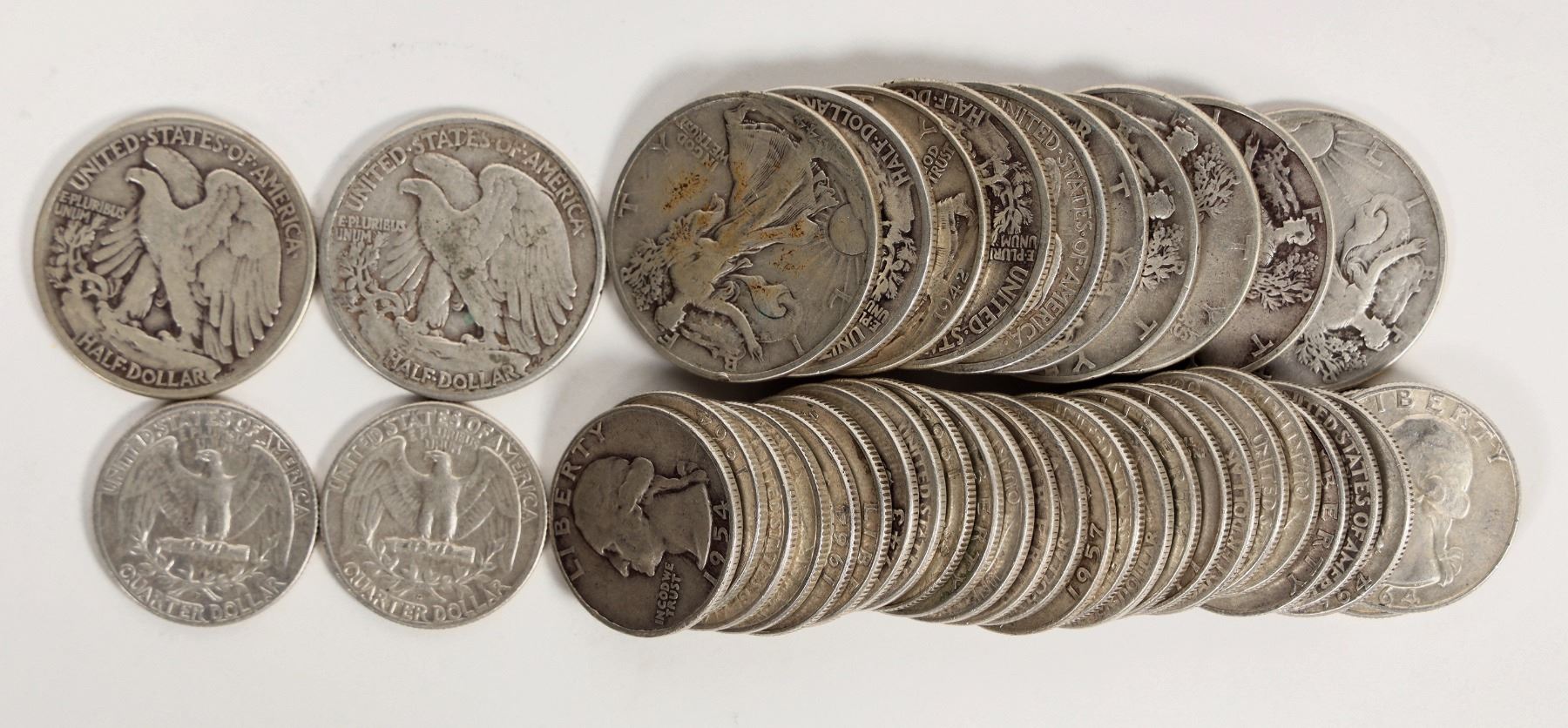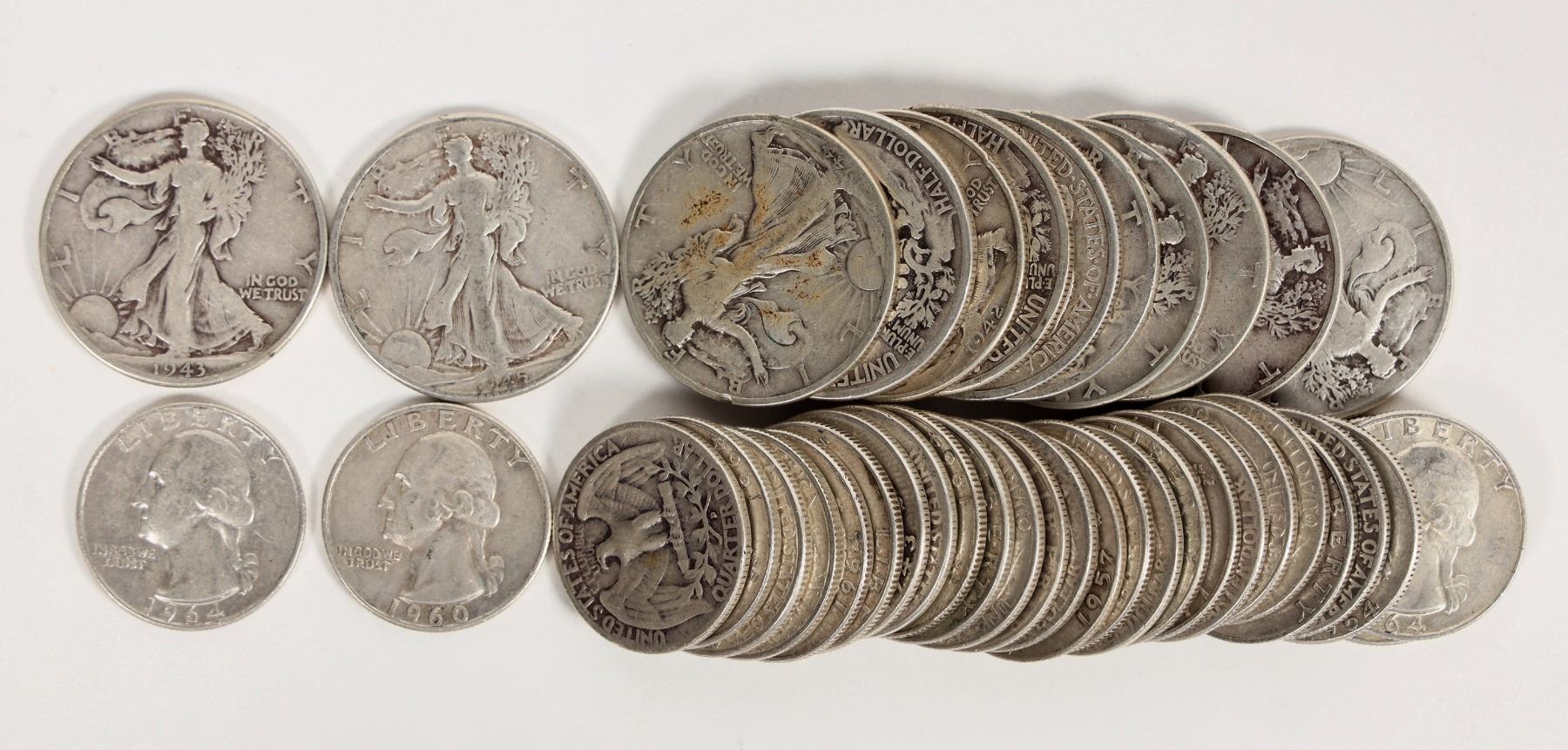 Twelve Walking Liberty half dollars; 29 Washington quarters 1964 or older.