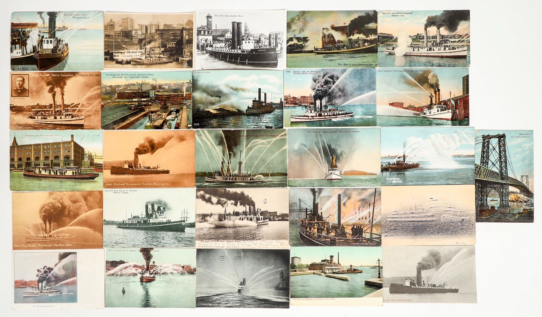 A lot of 26 postcards ranging from multi-color prints (18) to black and white prints (3), including 2 real photo postcards. These postcards portray U.S.A fireboats in action in 6 different US states including Oregon and New York and they date from 1907 to 1914. This lot contains no duplicates.