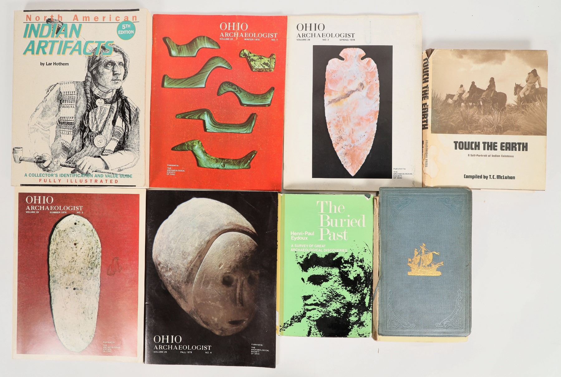 Group of 3 books and 4 magazines on archaeology and Indigenous history in the United States, published 1967-1994. Titles include 'The Buried Past' by Henri-Paul Eydoux, 'Touch The Earth: A Self-Portrait of Indian Existence' compiled by T.C. McLuhan, 'Indian Artifacts' by Lar Hothem, and 4 issues of 'Ohio Archaeologist'. See photos for more detail.