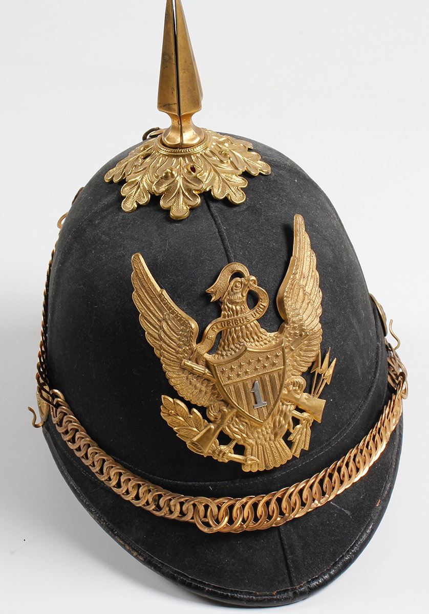 U.S. Army Dress Uniform, 1890. Early tall hat with brass spike top.Black felt body with brass fittings which include cavalry buttons, Army eagle hat plate, and parade dress spike. Large spread eagle at front brim with the number one inside the shield, e pluribus unum. Side buttons are crossed rifles. Possible parade hat, interlocking brass/gold colored rings as decoration. Maker not present circa 1890 to 1900. Hamilton Hat Collection. Date: Location: HWAC# 64472