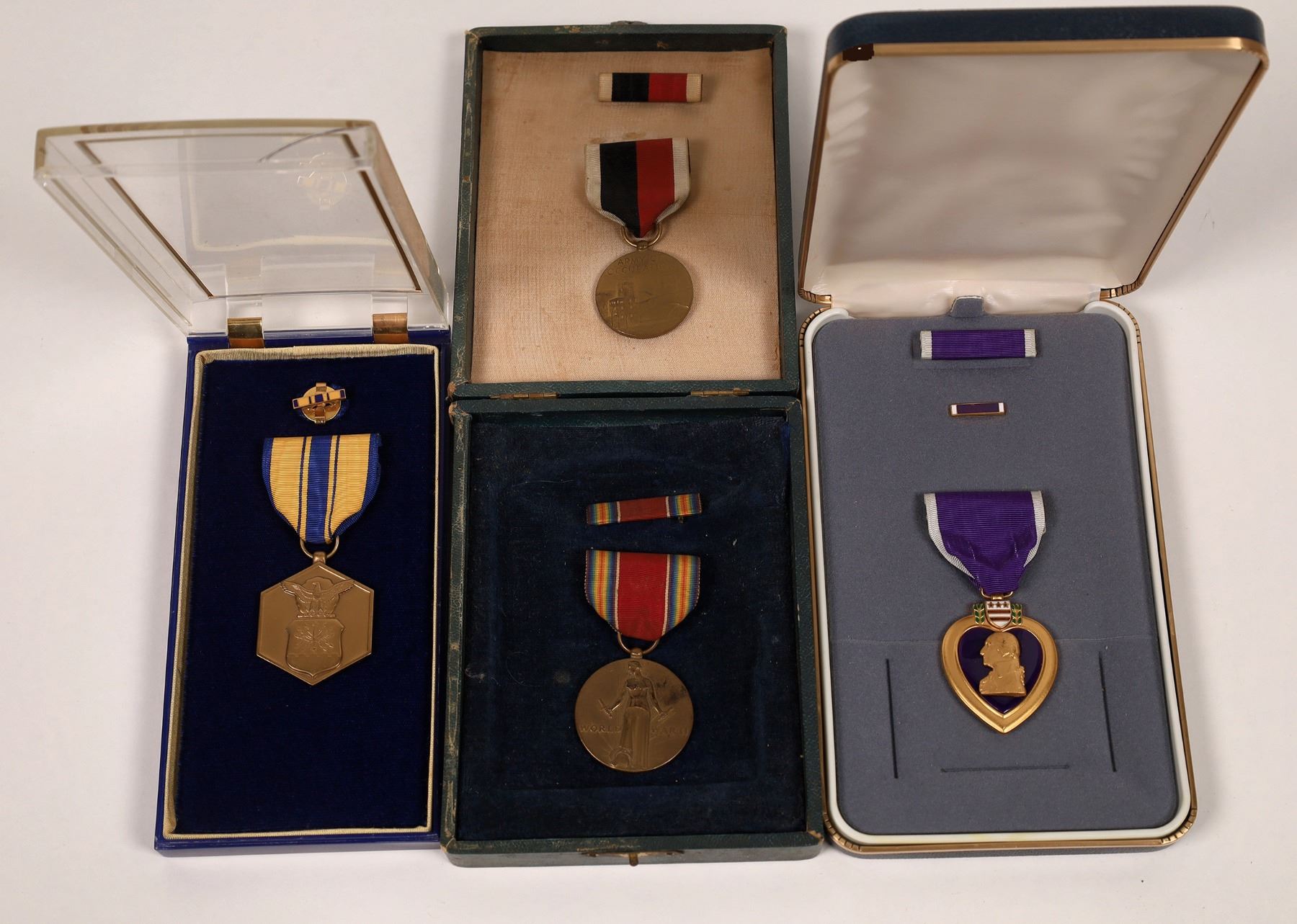 This is a U.S. Army Vietnam era Purple Heart medal with bar and lapel pin, unissued with case. There is an Army Commendation medal and lapel pin with original display box, and a WW 11 display box with the Army Victory Medal and Army Occupation Medal.