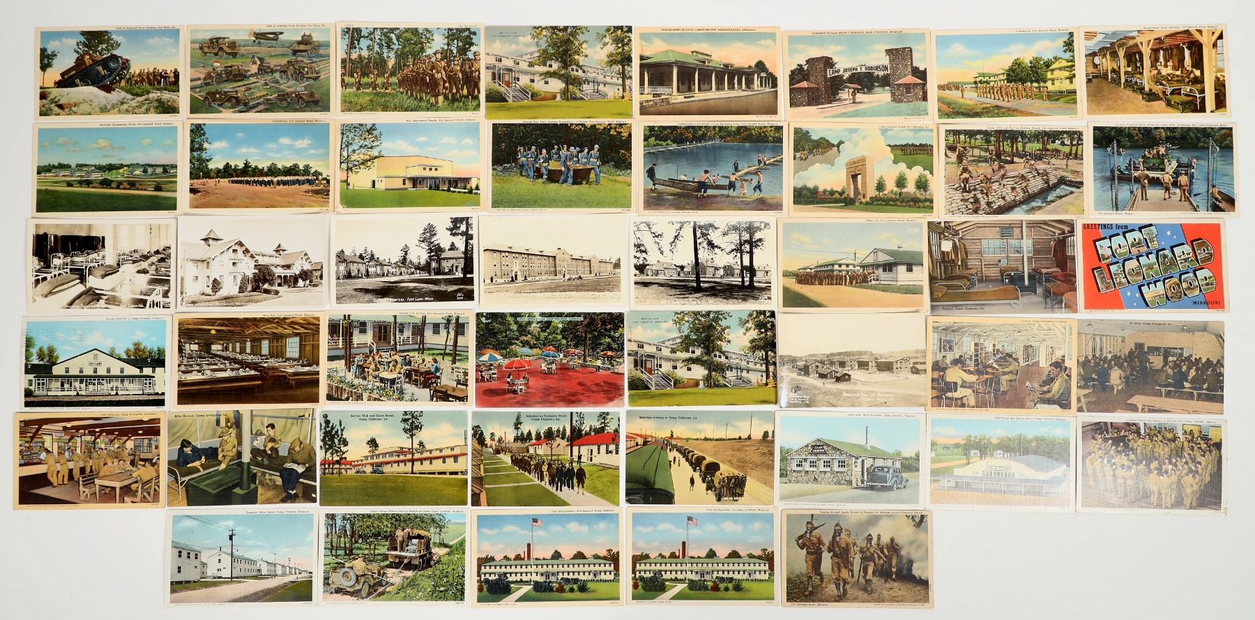 Lot of 45. Camp Livingston, LS, (4) ~ Fort Knox, KY, (4) ~ Camp Robinson, AR, (5) ~ Fort Wood, MS, (17) ~ Camp Crowder, MS, (6) ~ Camp Claiborne, LA, (4) ~ Fort Lewis, WN, (5) . Eight are postmarked :Camp Knox, Little Rock and other. One uncanceled 1 cent stamp. Five RPPC.