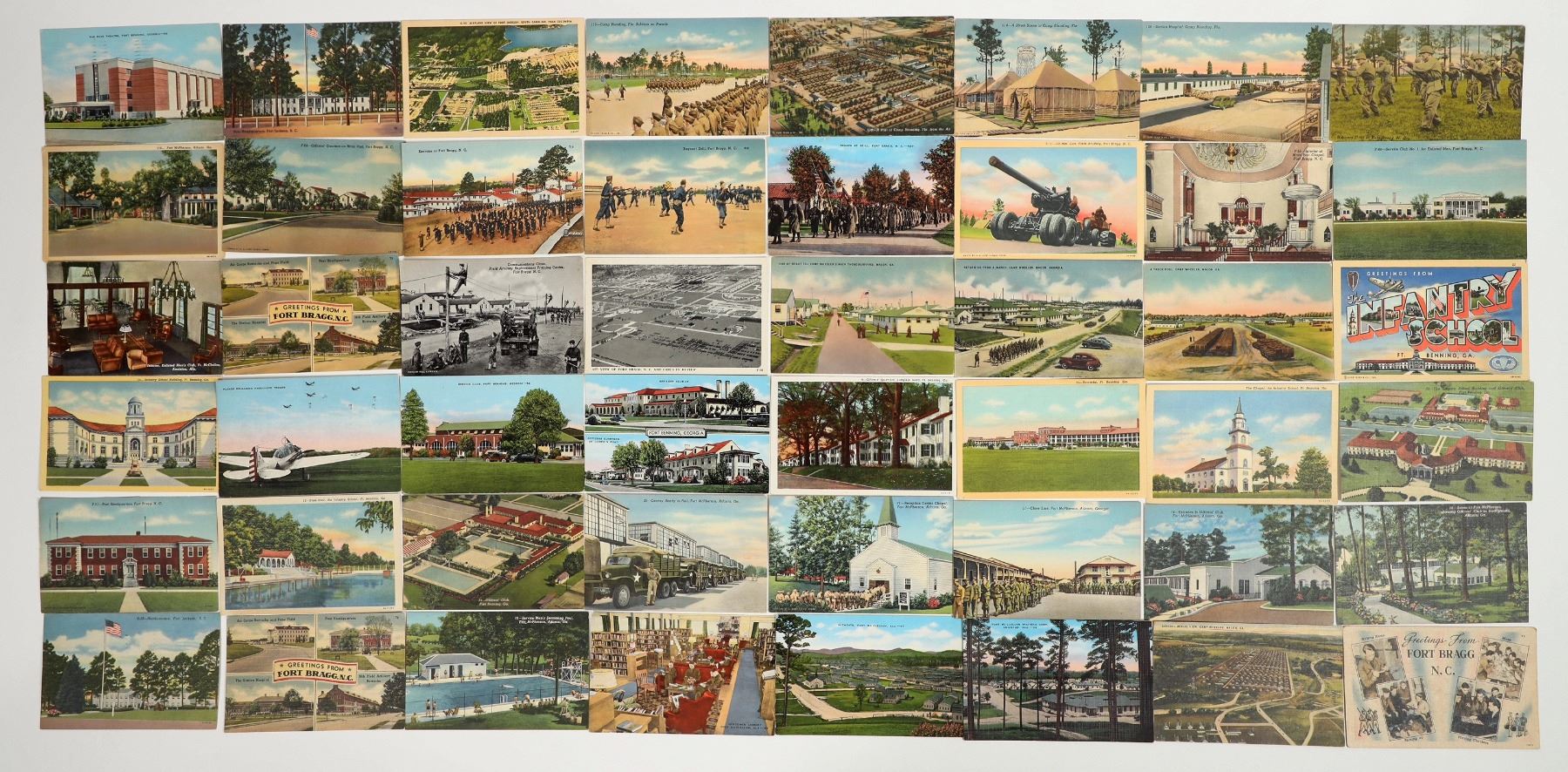 Lot of 48 U.S. Army WWII Training Facility PCs, #1, (48) Fort McPherson, GA (7) ~ Fort Benning, GA (12) ~ Camp Wheeler, GA(4) ~ Fort Bragg, NC (14) ~ Fort Jackson, SC (3) ~ Camp Blanding, FL (4) ~ Fort McCellan, AL (4). Eight are postmarked : Camp Wheeler, Baltimore, Columbia S.C, Fort Bragg. One uncancelled 1 cent stamp