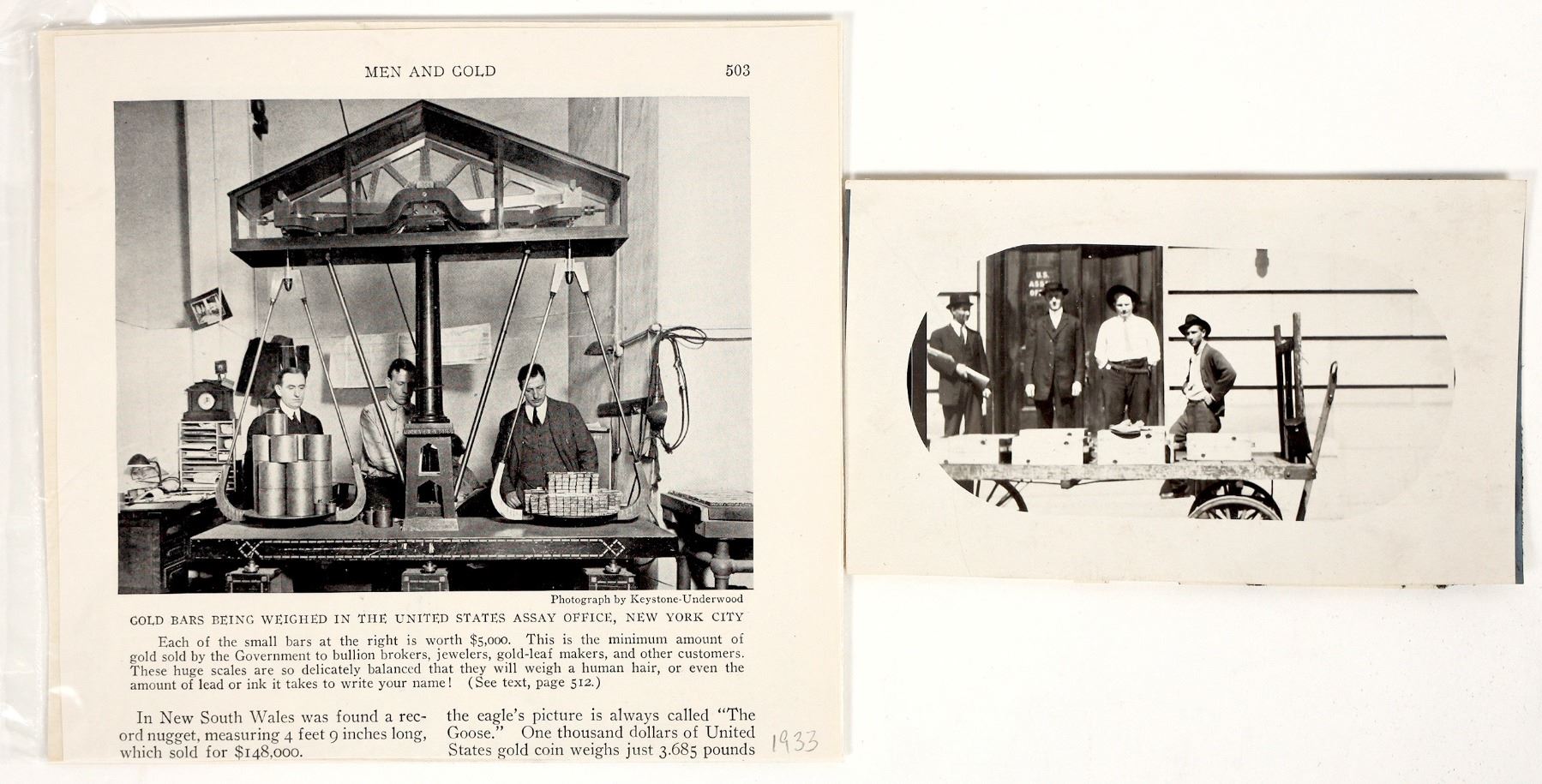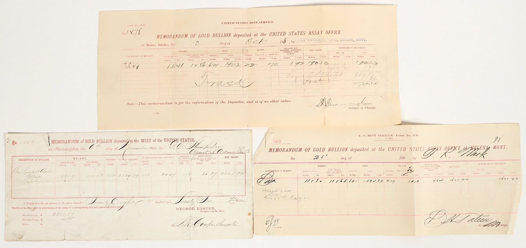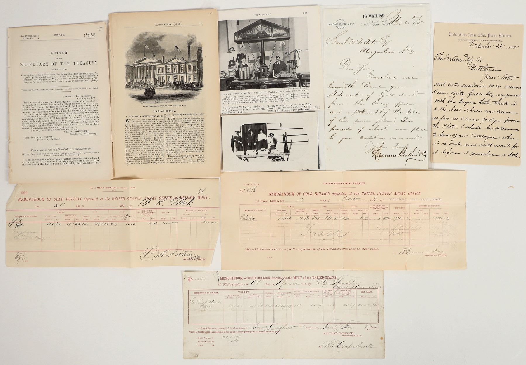 Group of ephemera and publications from U. S. Assay offices: 1) 1870 Treasury Department report on the assay office in New York and the branch mint in San Francisco; 1861 Harper's New Monthly Magazine article on making money at the assay office New York; 1933 Gold bars being weighed in the New York assay office photo. 2) 1866 letter from Lawrence Brothers Bankers of Wall Street to Morgantown W. Virginia statement of gold dust from the assay office. 3) 1898 Memorandum of Gold Bullion deposited at the United States Assay Office at Boise, Idaho (14 x 5 inches; red ink). 4) three assay receipts from U. S. Assay Office, Helena Montana: 1869, 1885 & 1901.