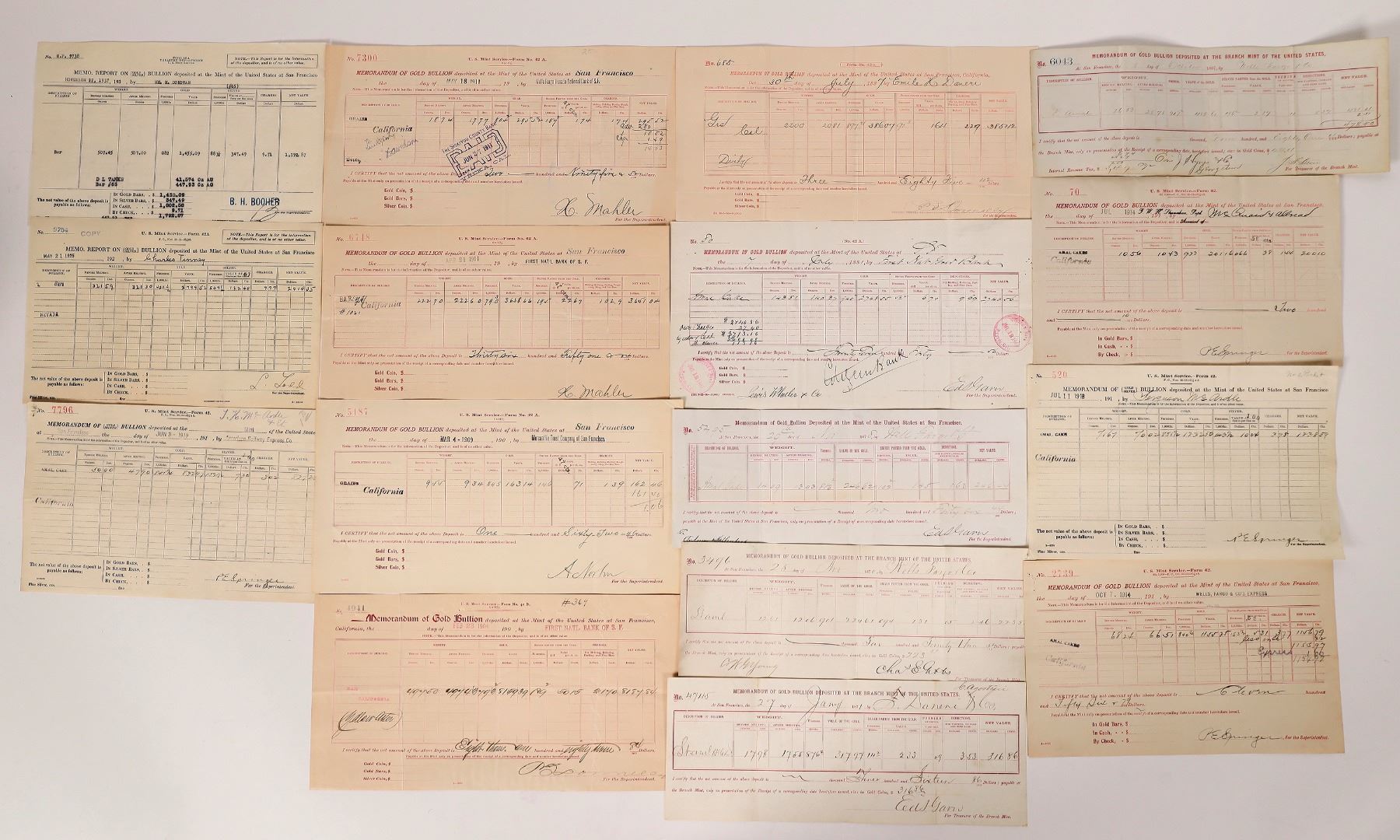 US Branch Mint, San Francisco Gold Bullion Deposit Collection. 15 Different gold bullion deposit receipts 1867-1937. This important collections shows a wide variety of deposits from different depositors throughout California.