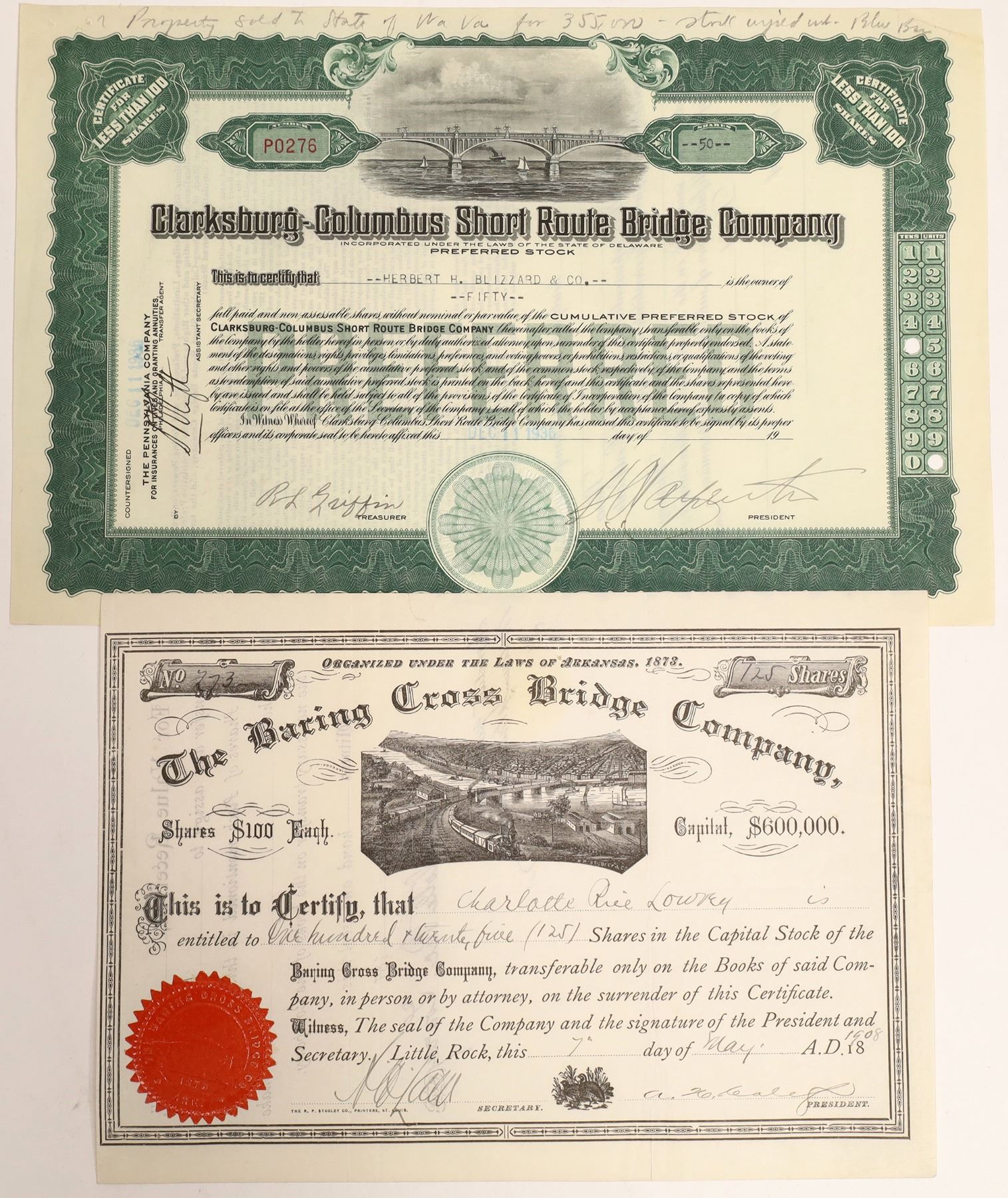 Two U.S. bridge building companies' stock certificates, with beautiful vignettes, from Arkansas and Ohio. The lot includes: The Baring Cross Bridge Company, with vignette of two trains crossing the Baring Cross Railroad Bridge over the Arkansas River, issued in 1908, signed by President and Secretary with dark orange company seal, 9 3/8" x 7", fine cond. w/ slight folds; and Clarksburg-Columbus Short Route Bridge Company, with vignette of arched bridge over the Ohio River and three vessels, issued in 1936, signed by President and Treasurer, 11 1/2" x 7 1/2", fine cond. Two suspension bridges built by the company in 1928 that span the Ohio River include the Clarksburg-Columbus Short Route Bridge and the Silver Bridge. The Silver Bridge collapsed during the afternoon rush hour during a busy Christmas shopping season, sending 32 vehicles into the icy waters of the Ohio River, killing 46 people. A new bridge was eventually built downstream, the Hi Carpenter Memorial Bridge, which opened for traffic in 1977.