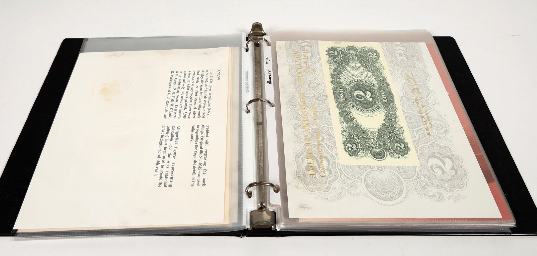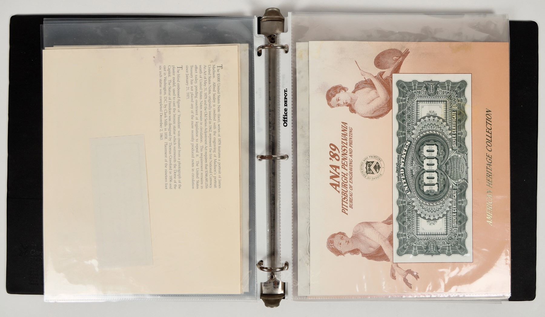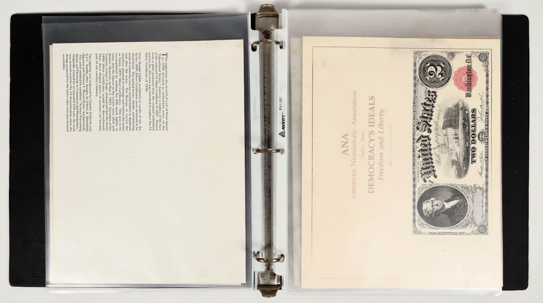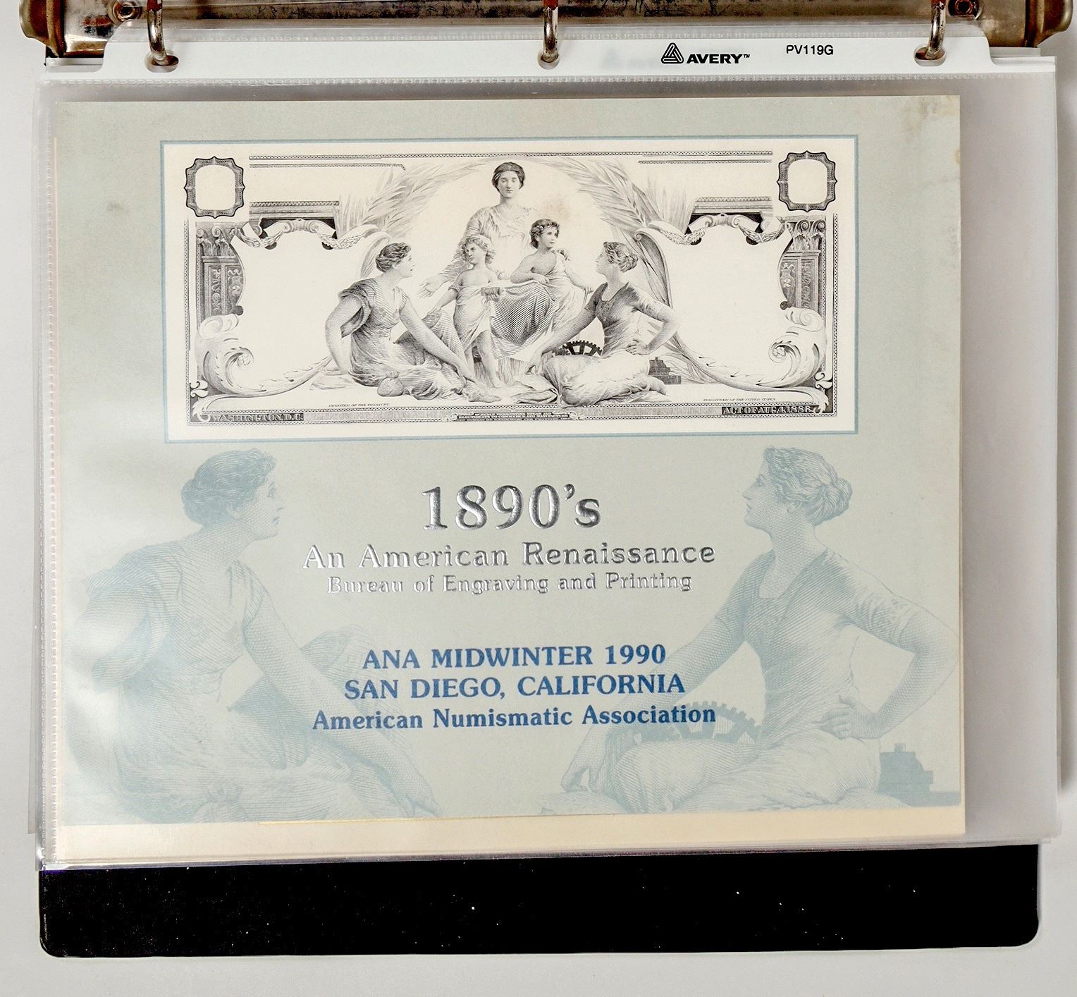 Twenty six souvenir sheets produced for various numismatic and philatelic organizations including ANA, FUN, TNA, IMPS, HSNA, EASTEX, ATS and others. 8 x 10 inches, with engravings of historic currency and stamp issues