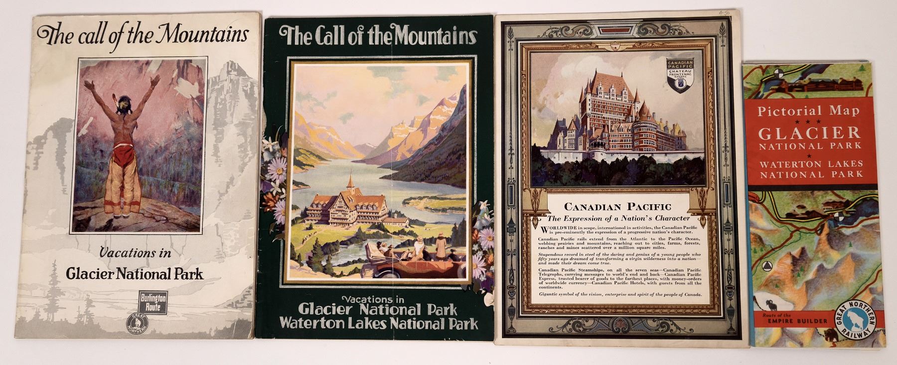 1) The Chateau Frontenac Hotel, Quebec, Canada, C-1930 Owned by Canadian Pacific Profusely illustrated with detailed floor plans for each level of hotel operations, photos of various rooms & facilities, a facsimile drawing of Quebec City and an accompanying map ~ (8"x 11"brochure, 14 pages) 2) The Call of the Mountains, Vacations in Glacier &Waterton Lakes National Parks - Two (2) separate and time different issues by the Great Northern R.R. in 1927 and C-1930 Each contains photos, descriptions, & rates for the Parks accommodations, transportation, tours & activities - Both also have up to 49 pages, with a colorful double-page map in the center 3) Glacier & Waterton Lakes NPs Pictorial Map, issued by the Great Northern R.R., 1939 Beautiful 27" x 31"multi-fold map