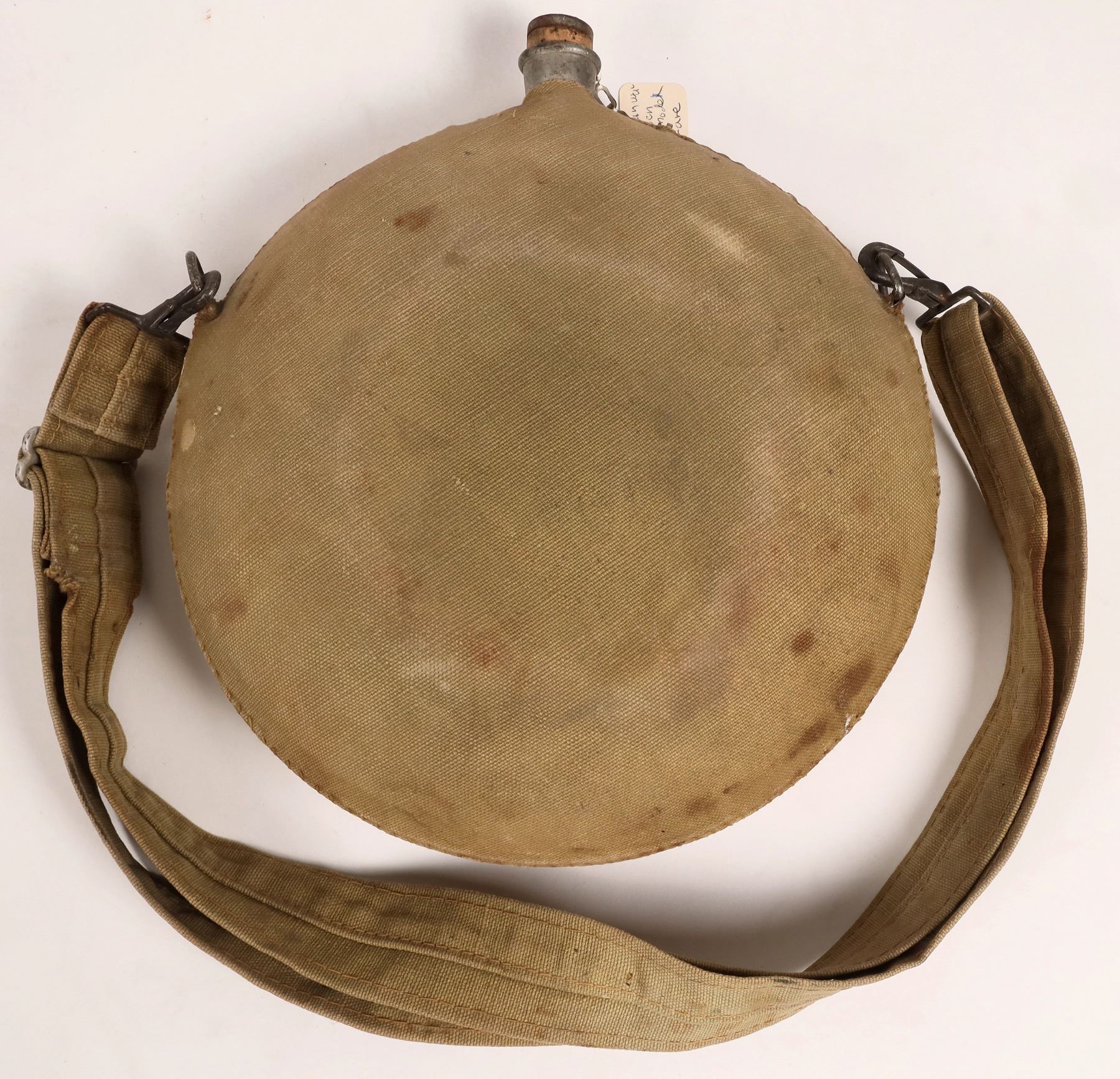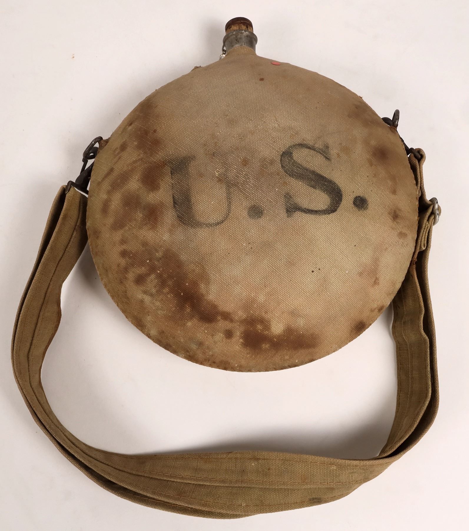 This canteen is canvas covered and marked "U.S." with its original cork stopper. Large capacity "Arizona" model. The canvas is light green in color, faded slightly on one side. Roughly 10 in. diameter. From the Sherman collection.