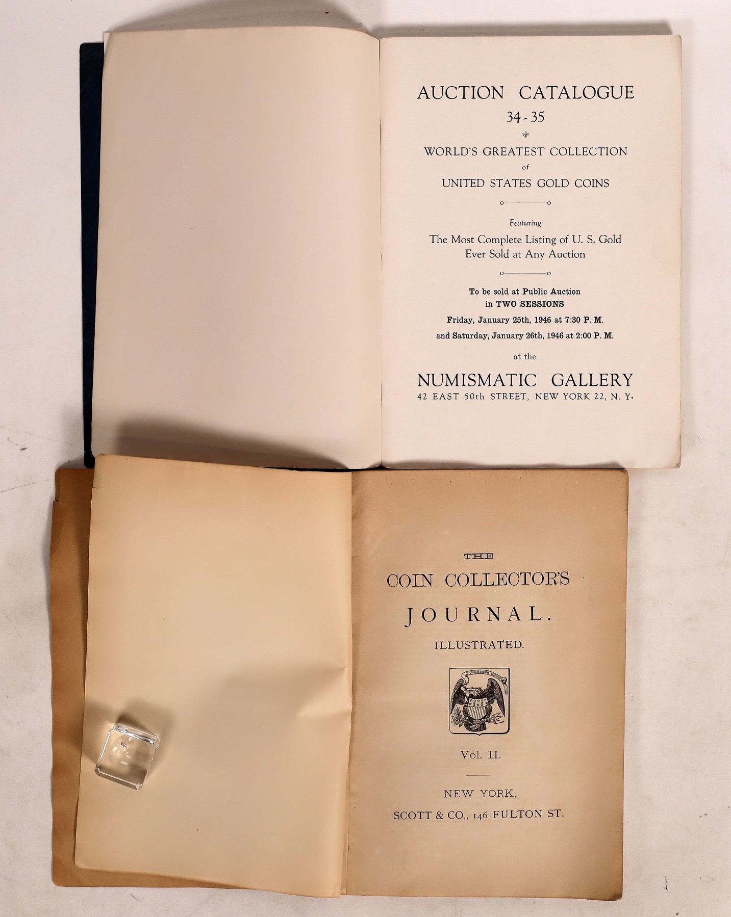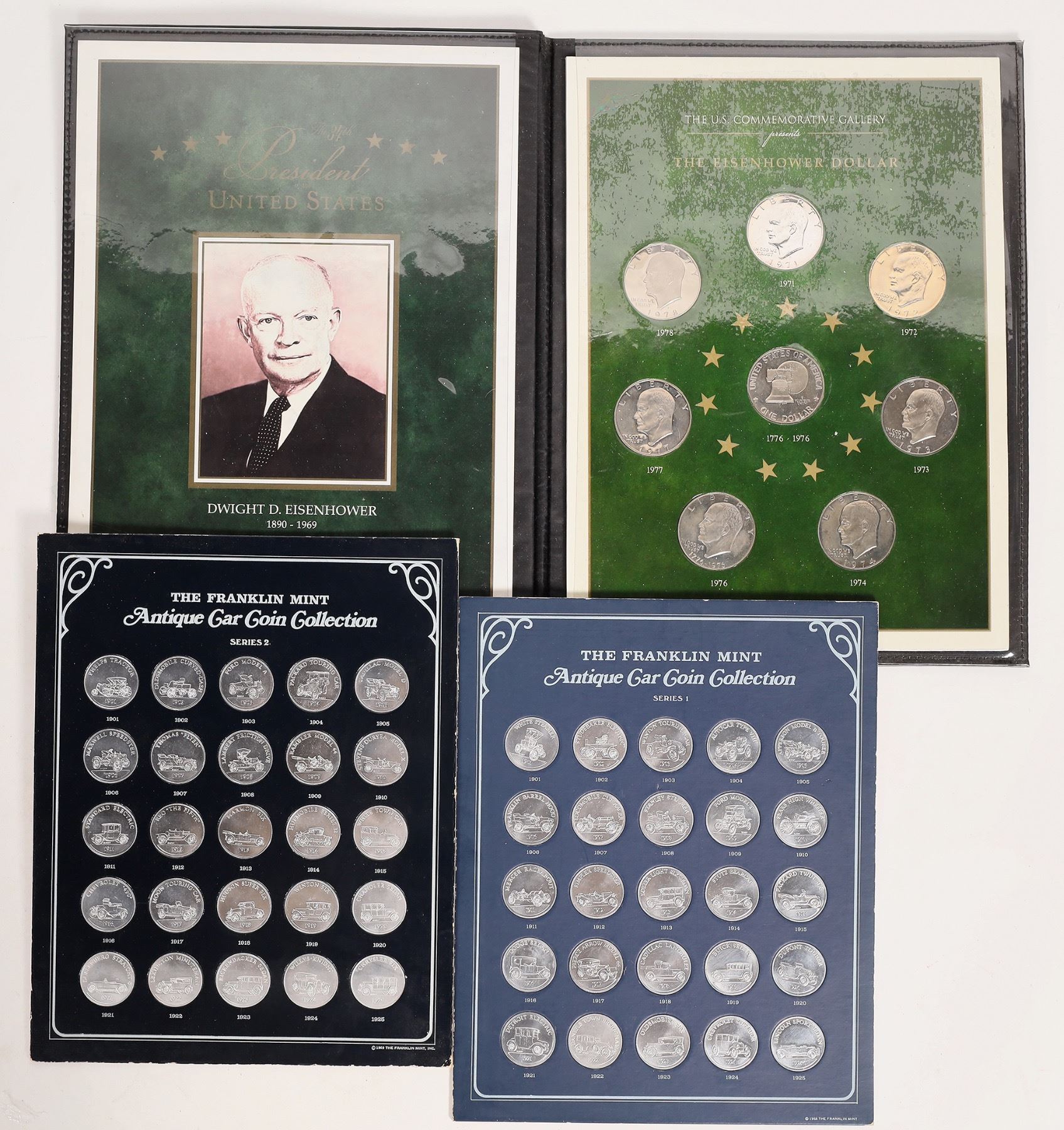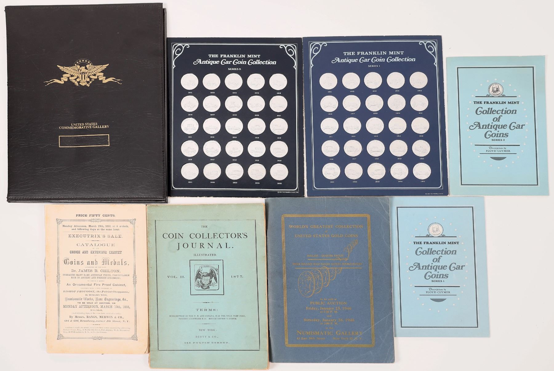 Lot of five coin related items: 1) 1865 catalogue Dr. James R. Chilton auction by Bang, Merwin & Co. 2) 1877 Coin Collector's Journal Volume Two. 3) 1946 Numismatic Gallery auction catalog of the World's Greatest Collection of United State Gold Coins. (Abe Kosoff's company) 4) The Franklin Mint Antique Car Coin Collection (50 coins and two guide books); 5) U.S. Commemorative Gallery tribute to Dwight D. Eisenhower with eight Ike dollars, 1971-78 and the Bicentennial reverse.