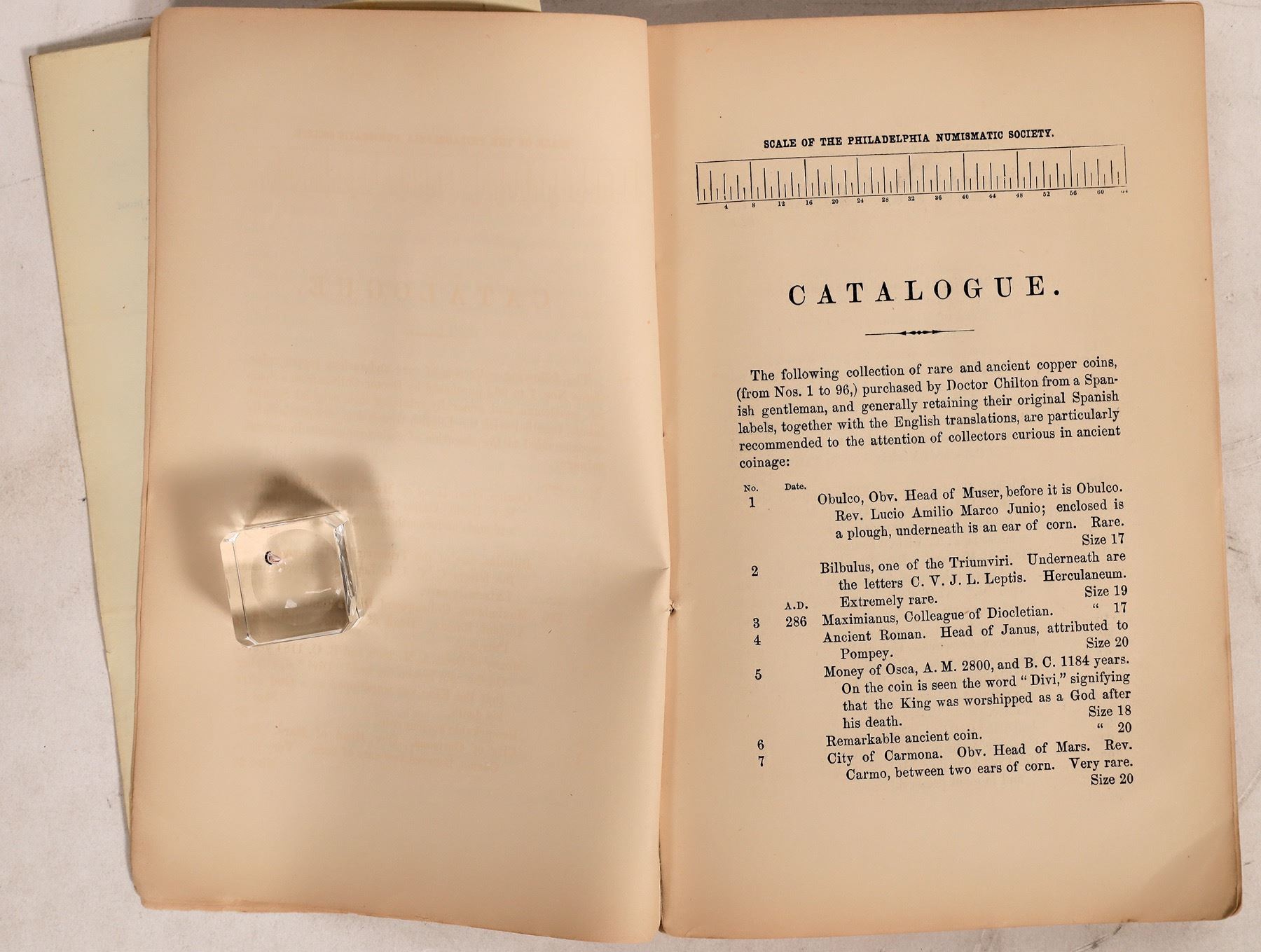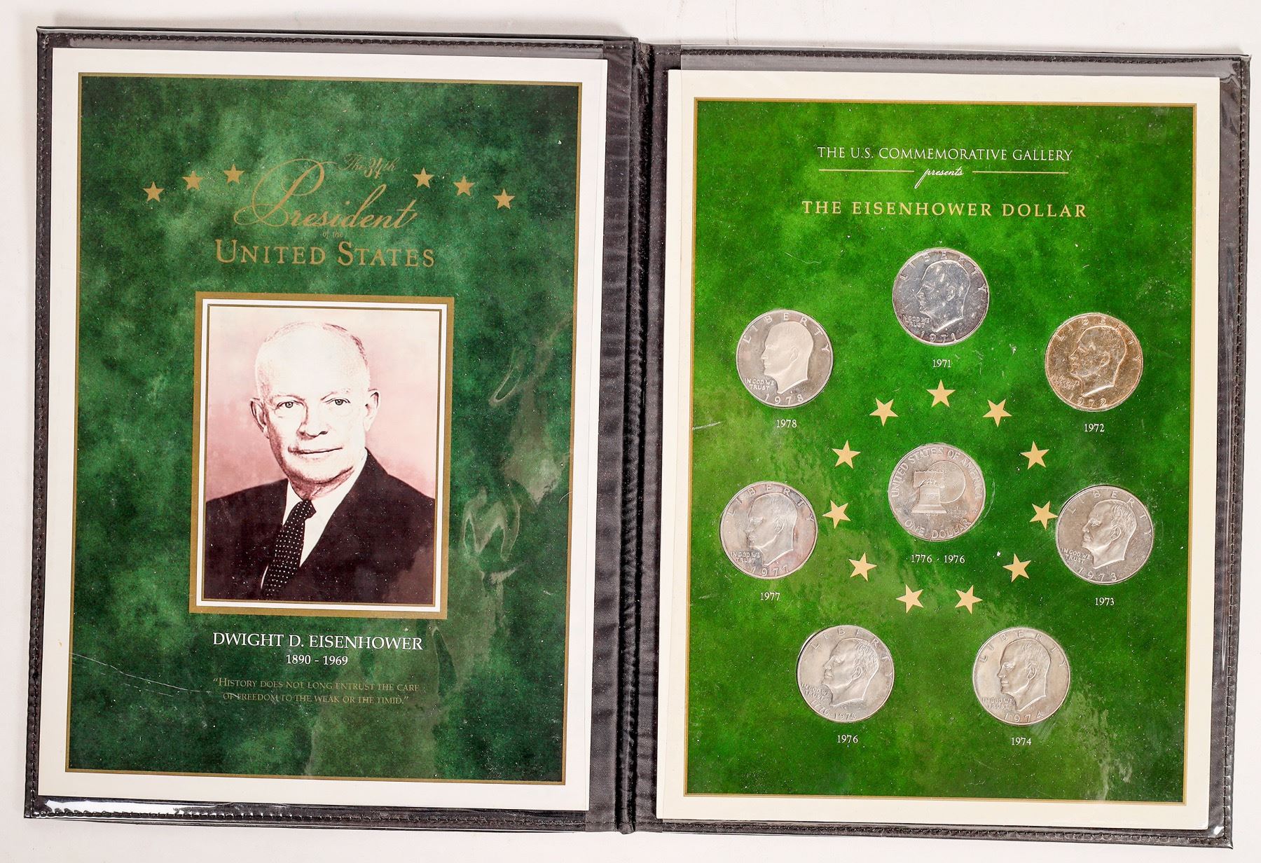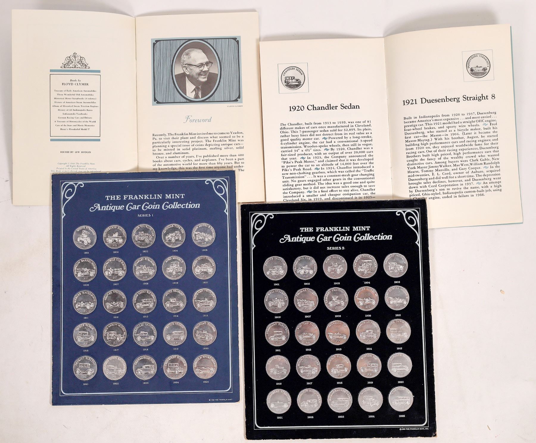 Lot of five coin related items: 1) 1865 catalogue Dr. James R. Chilton auction by Bang, Merwin & Co. 2) 1877 Coin Collector's Journal Volume Two. 3) 1946 Numismatic Gallery auction catalog of the World's Greatest Collection of United State Gold Coins. (Abe Kosoff's company) 4) The Franklin Mint Antique Car Coin Collection (50 coins and two guide books); 5) U.S. Commemorative Gallery tribute to Dwight D. Eisenhower with eight Ike dollars, 1971-78 and the Bicentennial reverse.