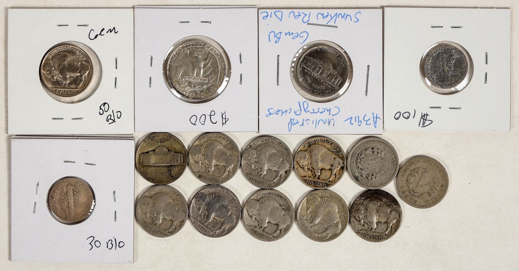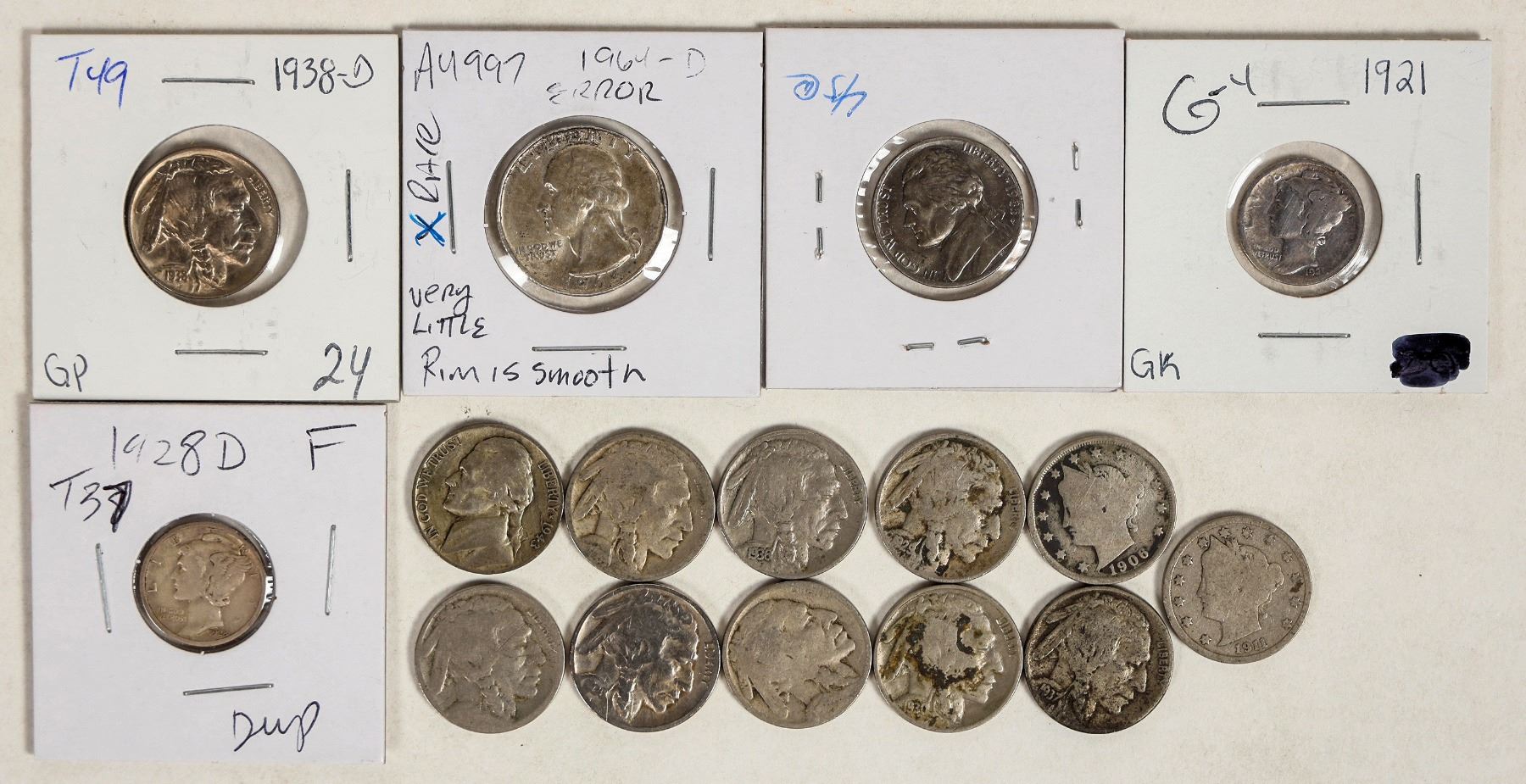 Strange group of coins: 1964-D Washington quarter with smooth rims rather than reeding; an error, or mutilation? 1985 Gem BU Jefferson nickel with sunken reverse die; 1921 Mercury dime, F-AG; 1938-D AU Buffalo nickel; 1928-D Mercury dime, G-VG; 1943-P Jefferson nickel; ten circulated Buffalo and Barber nickels.