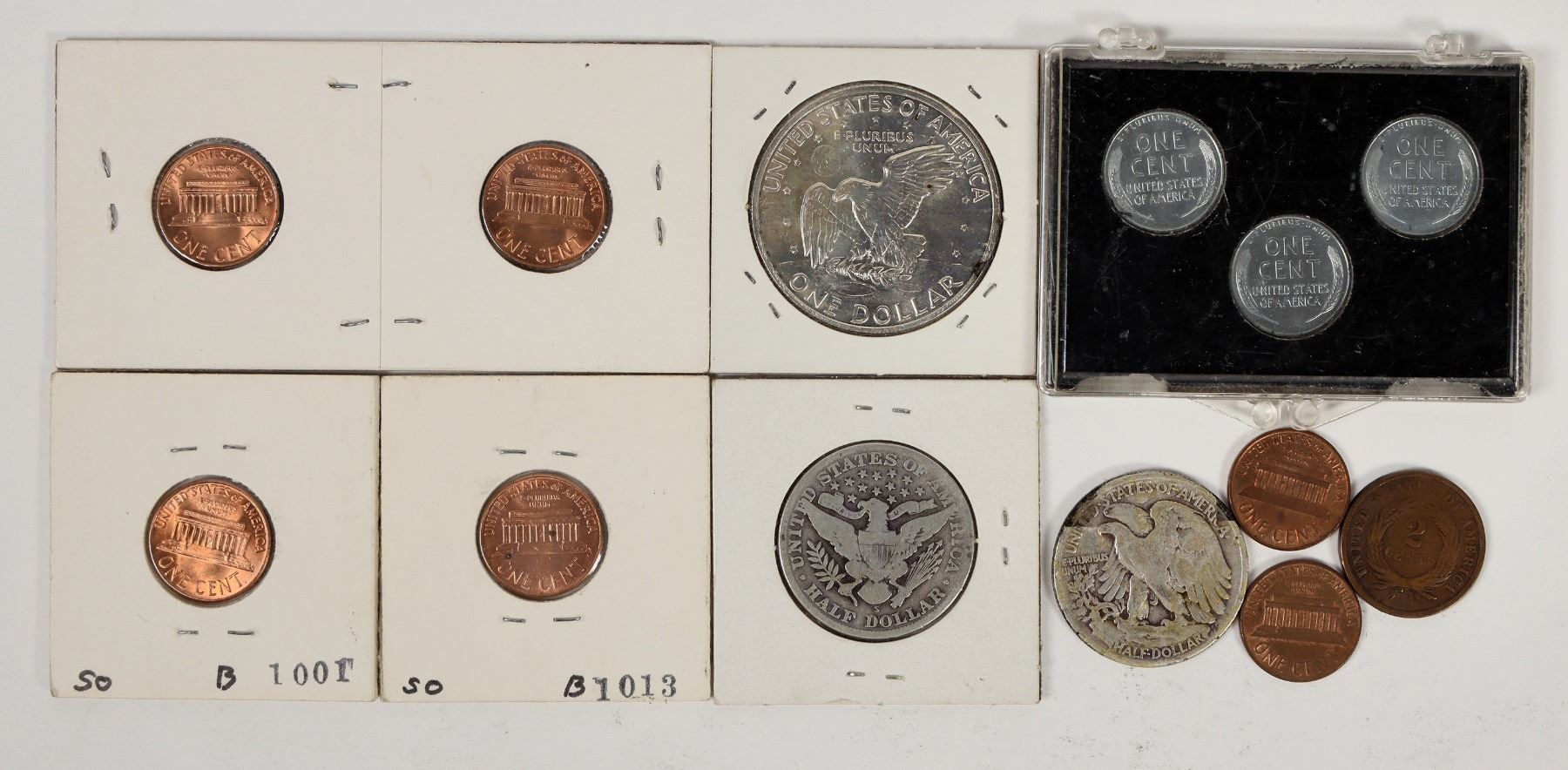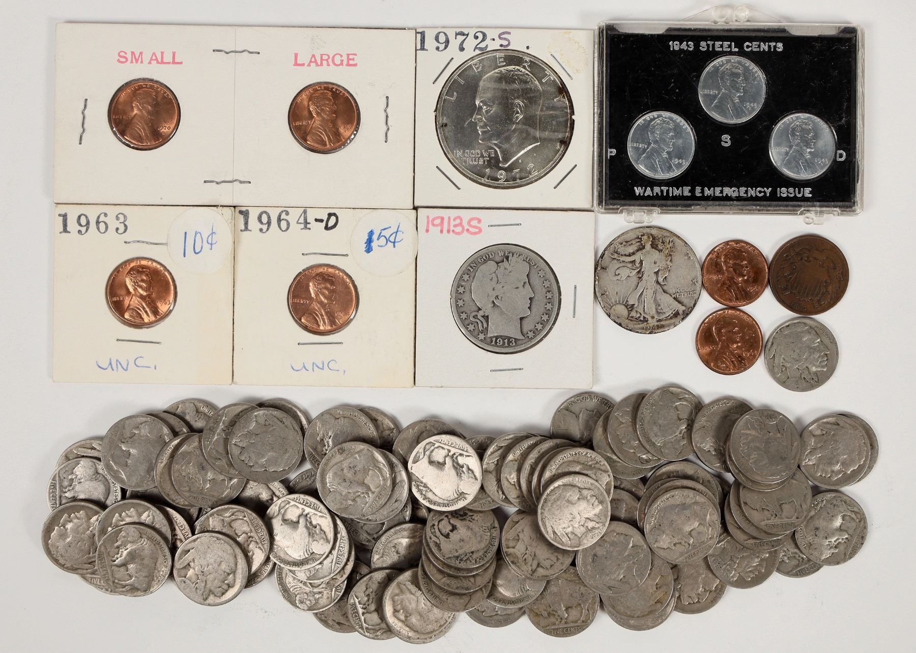 Miscellaneous batch of U. S. coins: 1835 large cent (G-Vg); 1865 two cent piece (G-VG); 1913-S Barber half dollar (G); 1945 Walking Liberty half dollar (damaged); 1972-S Ike dollar (proof with carbon spots); BU Lincoln pennies: 1963, 1964-D, 1970-S small date; 1970-S large date; 96 Buffalo nickels; hard plastic case with three steel cents from 1943.