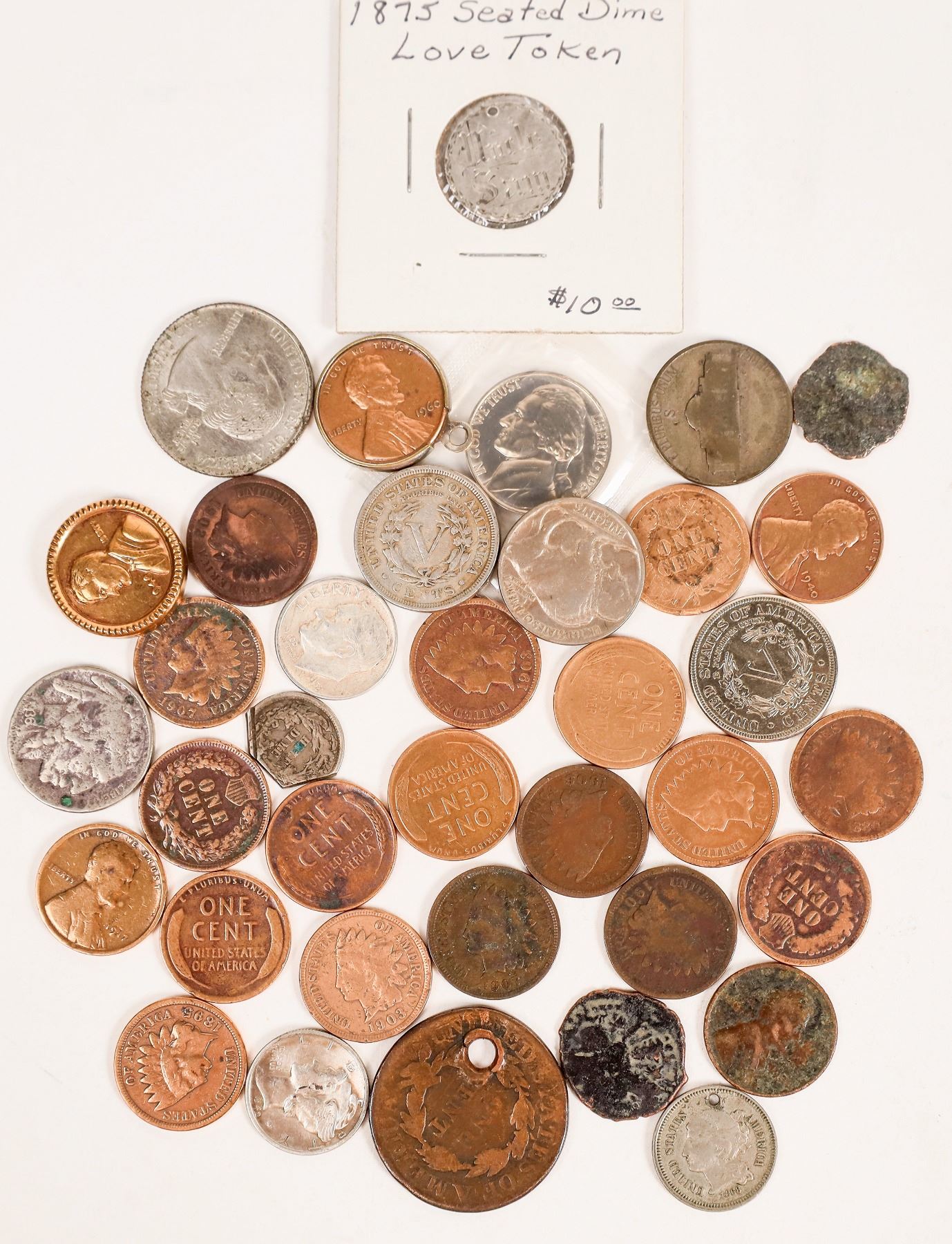Miscellaneous lot of U. S. coins. 1832 large cent (holed); 13 Indian Head pennies: 4 in the 1800s; 7 wheat back Lincoln cents: 1914, 1917, 1930-S and others; 1868 three cent piece (holed); 2 Buffalo nickels: 1936 D & S; 1912 Liberty nickel; 1913 Liberty Nickel (copy); 1943-S Jefferson War Nickel; 1964 BU Jefferson nickel; 1942-S Mercury dime; 1952-S Roosevelt dime; fantasy Clinton quarter; 1875 Seated Dime Love Token, engraved "Uncle Sam" and holed; 1860s half dime, clipped; two Lincoln pennies made into jewelry.