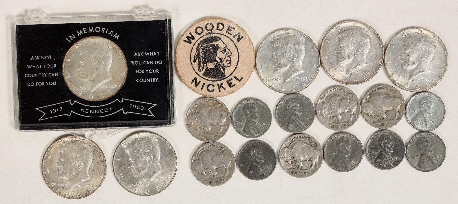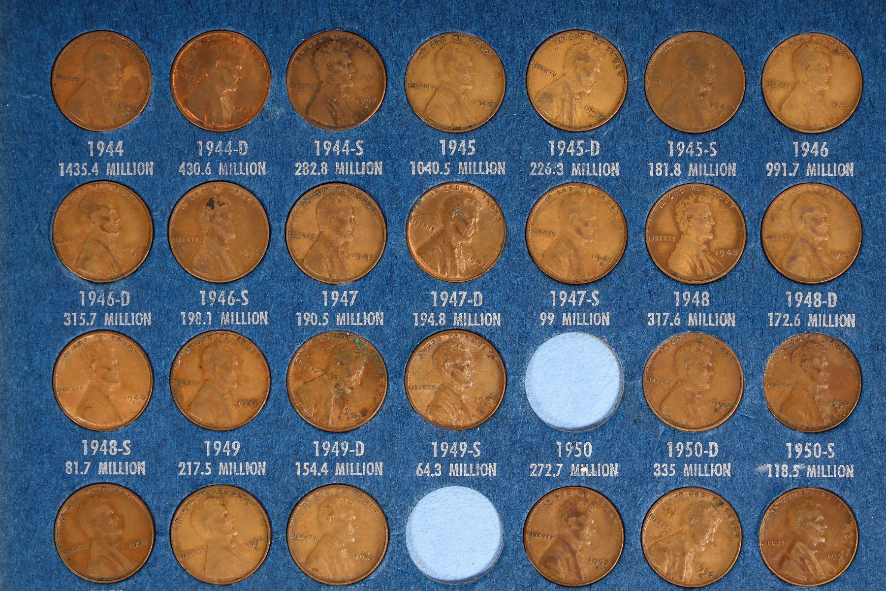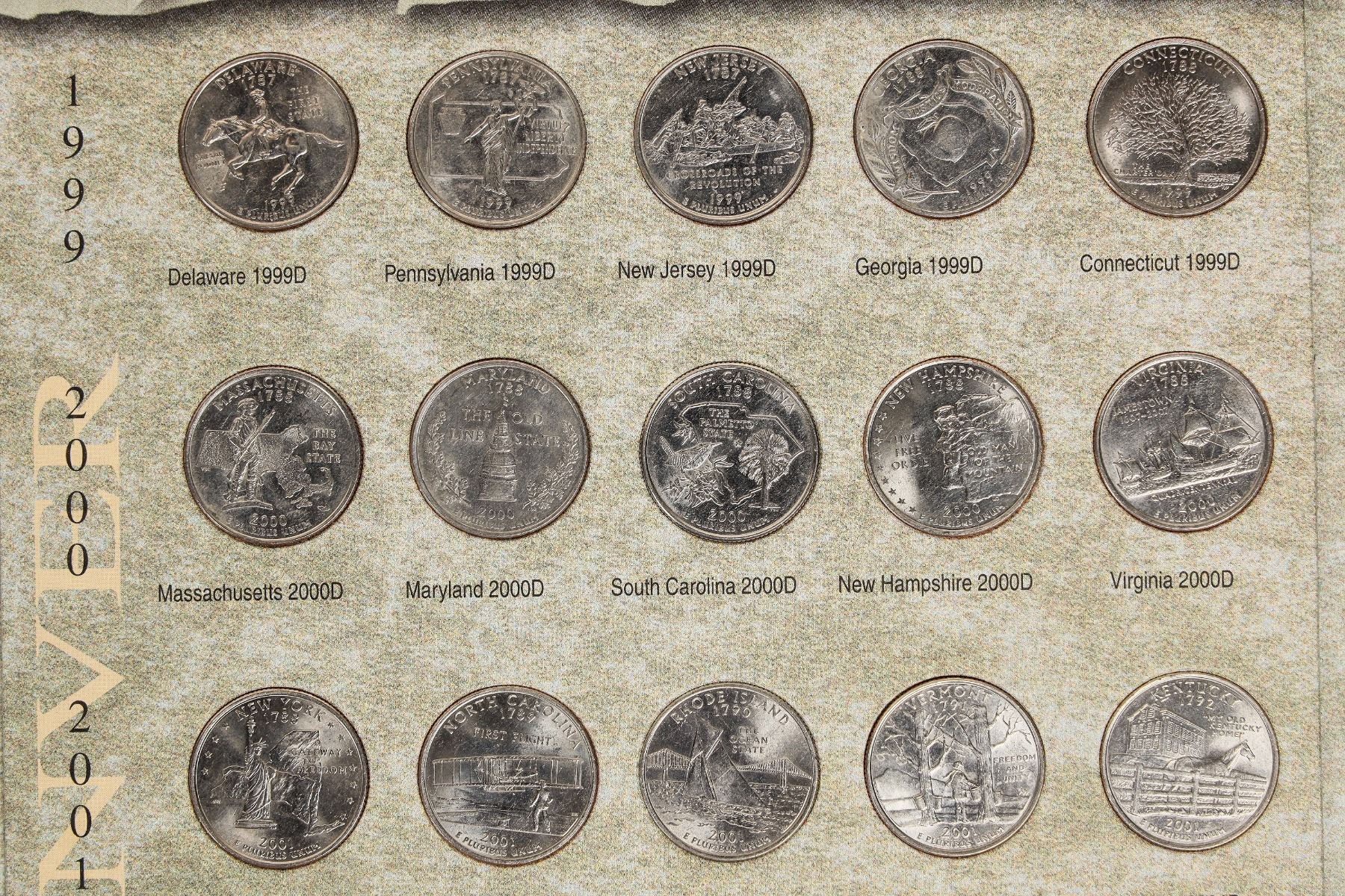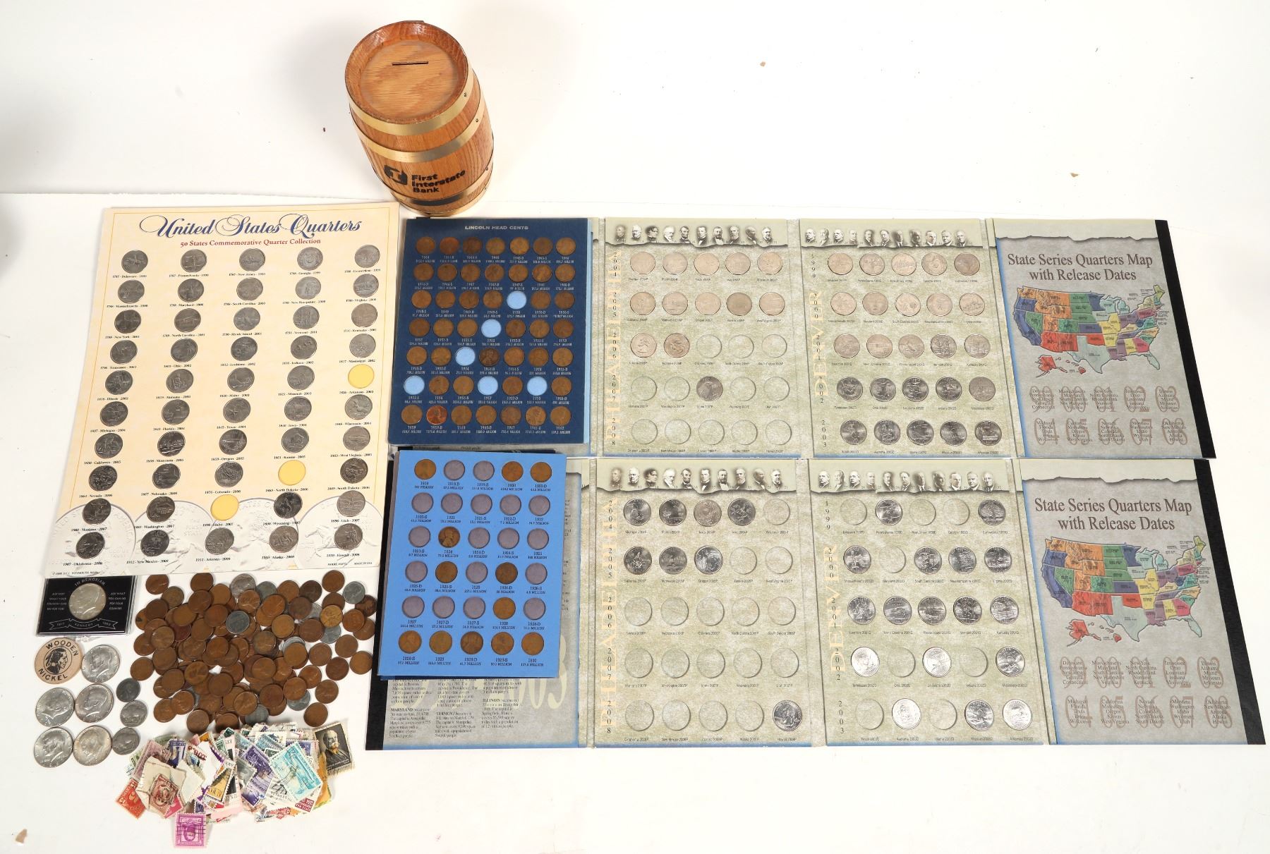 Five coin albums, a grab bag and a First Interstate Bank wooden barrel coin bank. A State commemorative quarter display board has 47 quarters in it. One album has 64 quarters. Another state album has 86 quarters. Blue Whitman Lincoln cent album 1909-1940 has 29 pennies in it. Lincoln cent album starting 1940 has 64 pennies. The grab bag has 6 40% silver Kennedy half dollars, about 60 wheat back pennies, a few Buffalo nickels and several packets of stamps, and a 1964 Nevada Centennial wooden nickel. The wooden barrel coin bank is empty but stands 6 inches tall and is 4 inches wide.