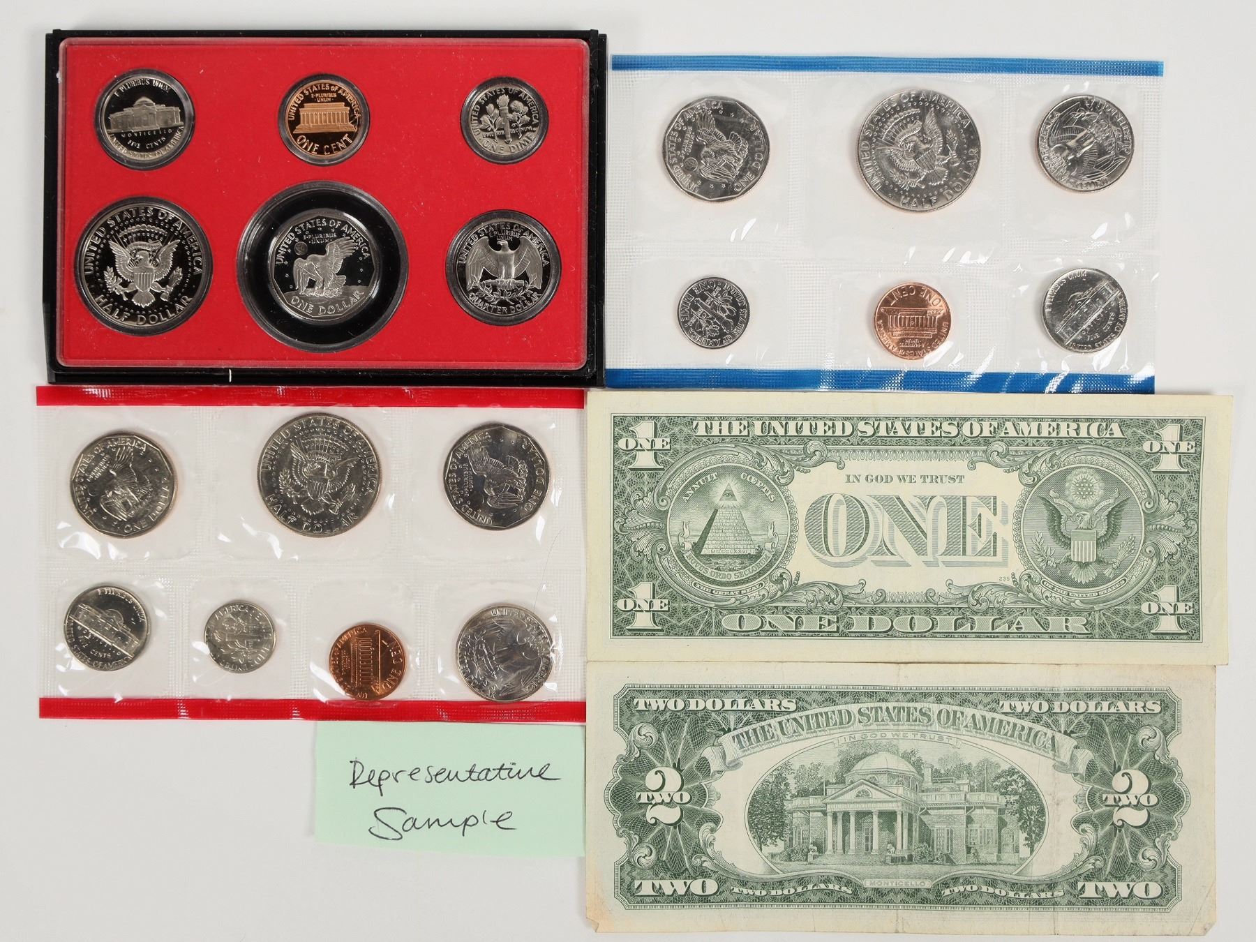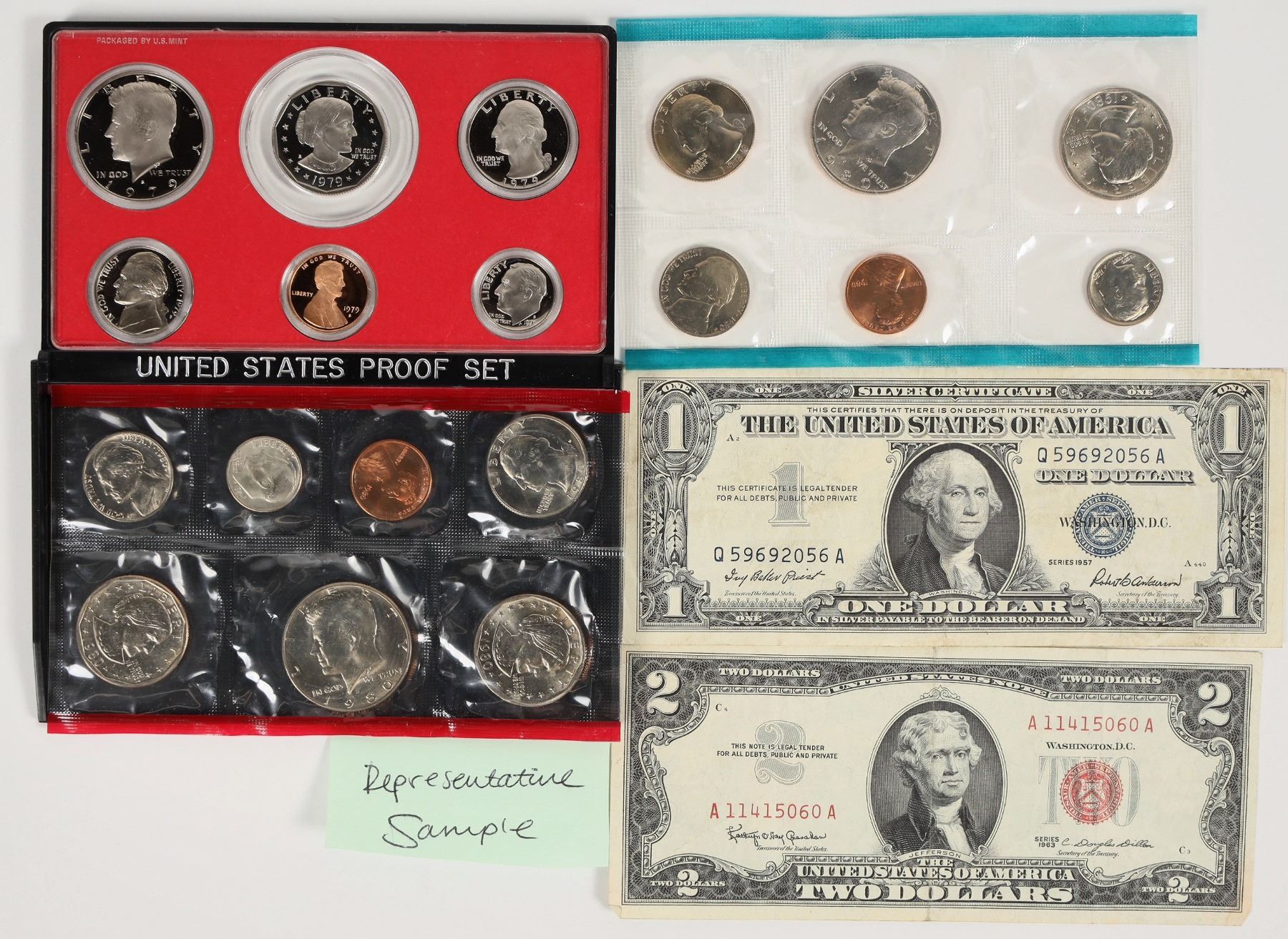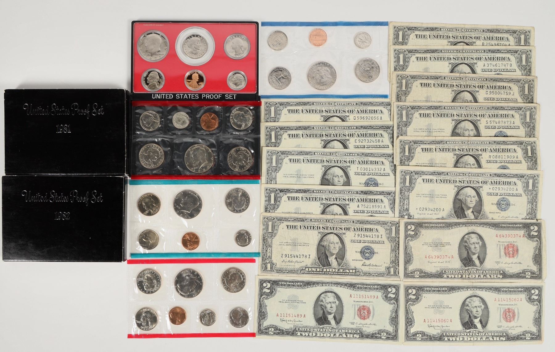 Two uncirculated sets: 1980, 1981. Three U. S. Proof Sets: 1979, 1981, 1982. Three $2 bills EF-AU condition. Eleven $1 silver certificates.