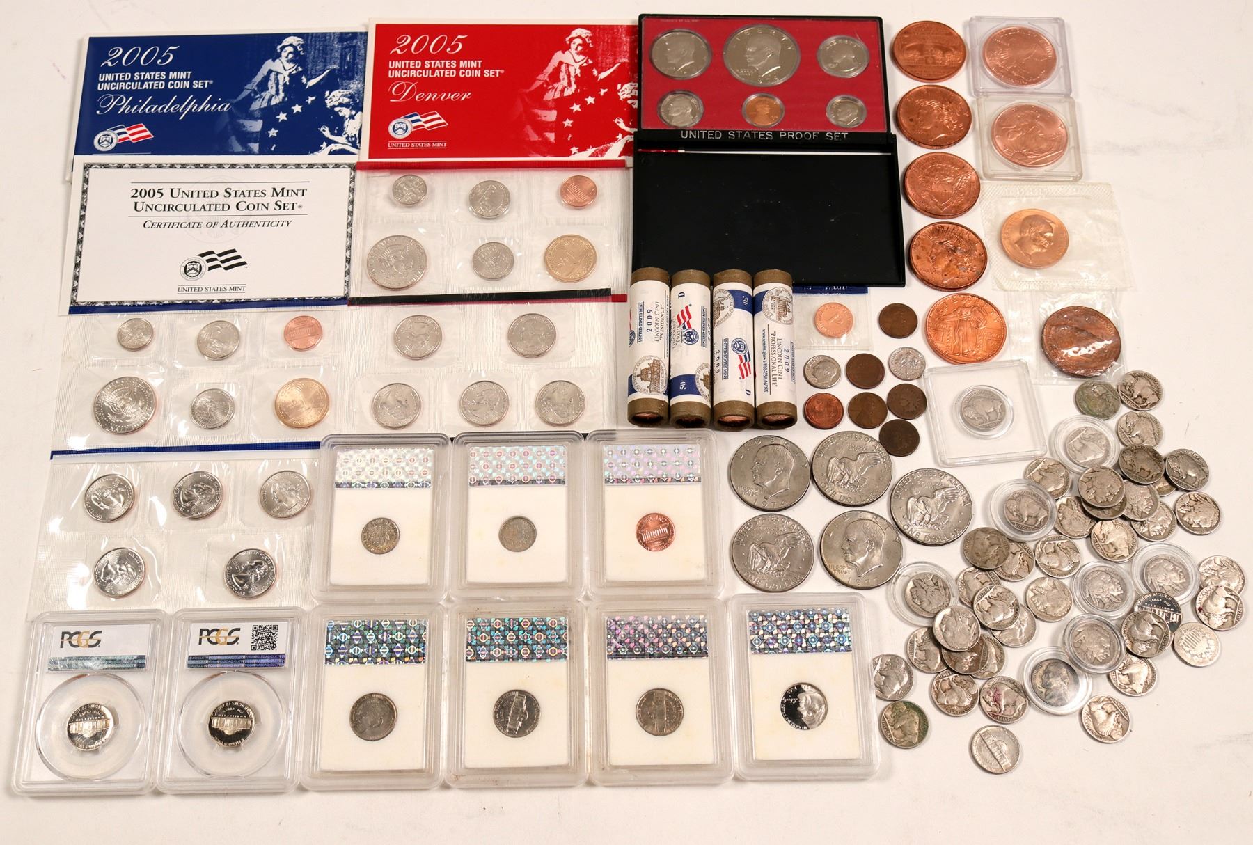 Lot #1 : Penny's (8 items ) : Indian Heads: 1886 & 1874 ( worn), Wheat Cents: 1916 & 1942 ( average ), 1947( good) & 1947 S average. 2007-D, BC encased. 4 rolls of pennies : 2009 D & P-" Presidency"& 2009 D & P " Professional Life" ( all in Mint wrappers). Lot #2: Proof Set: 1978 cased. Lot # 3 : 2005 D & P Mint Set. Lot # 3 Liberty copper rounds ( no dates), 3 Liberty Copper rounds( 1921), (i) Ben Franklin 100 Dollars, (1) President Lincoln & Denver Mint coin. Lot # 4 : ( 5) Eisenhower Dollars, 4/ 1974-D, & (1) 1977 Philly. Lot # 5 : (4 ) Dimes: 1978-S Proof, ( 2) INB Encased / BU 1980 & 1984, & 1989-D Roosevelt. Lot # 6 : Uncirculated/ " P " / Philadelphia // Treasury Motif: Shield / United States Mint// Lot # 7 : All nickles : 1868, 1904, 1926, 1927 ( 3), 1928 ( 6 plain), 1936 (3 plain) & 1-S,1930, 1935 plain & D, 1945-P, 1962 Plain " Proof", 1963-D, 1960-p BU/ (INB), 1964, 1967 BU / INB, 1974-p BU/ INC, 1977, 1993-S..PCGS PR69DCAM, 1995--S PCGS PR69DCAM, & 2005-S Bison D Gem Proof, CAM. Plus 23 Buffalo , that can not be read. Houghton Estate Collection