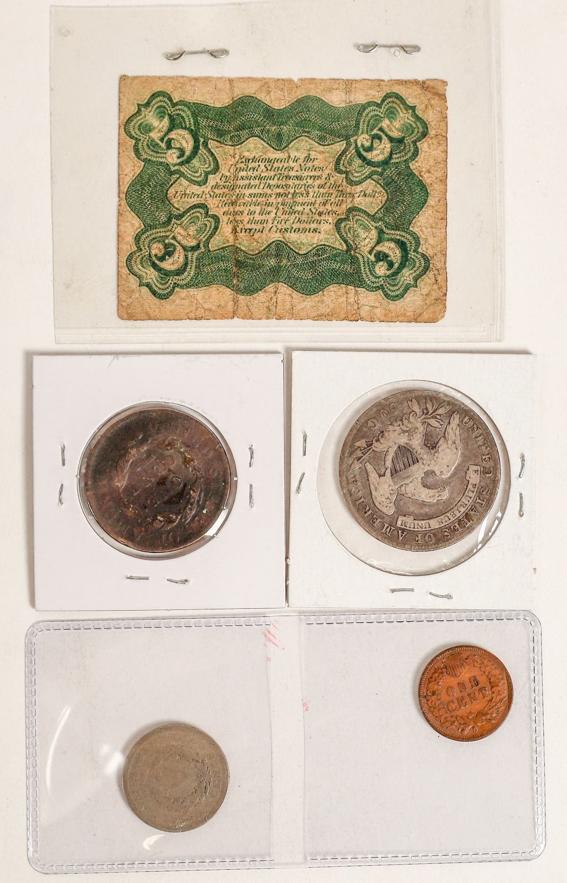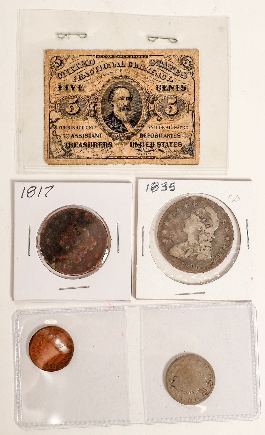 Miscellaneous quintet of U. S. money: 1817 Coronet Head Cent, G-VG; 1893 Indian Head cent, G with a scratch; 1907 Liberty nickel, AG-G; 1835 Capped Bust half dollar, G-VG; United States Fractional Currency five cents, 1863, G-VG condition.