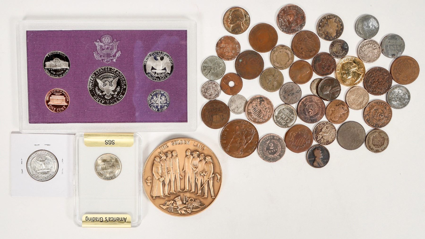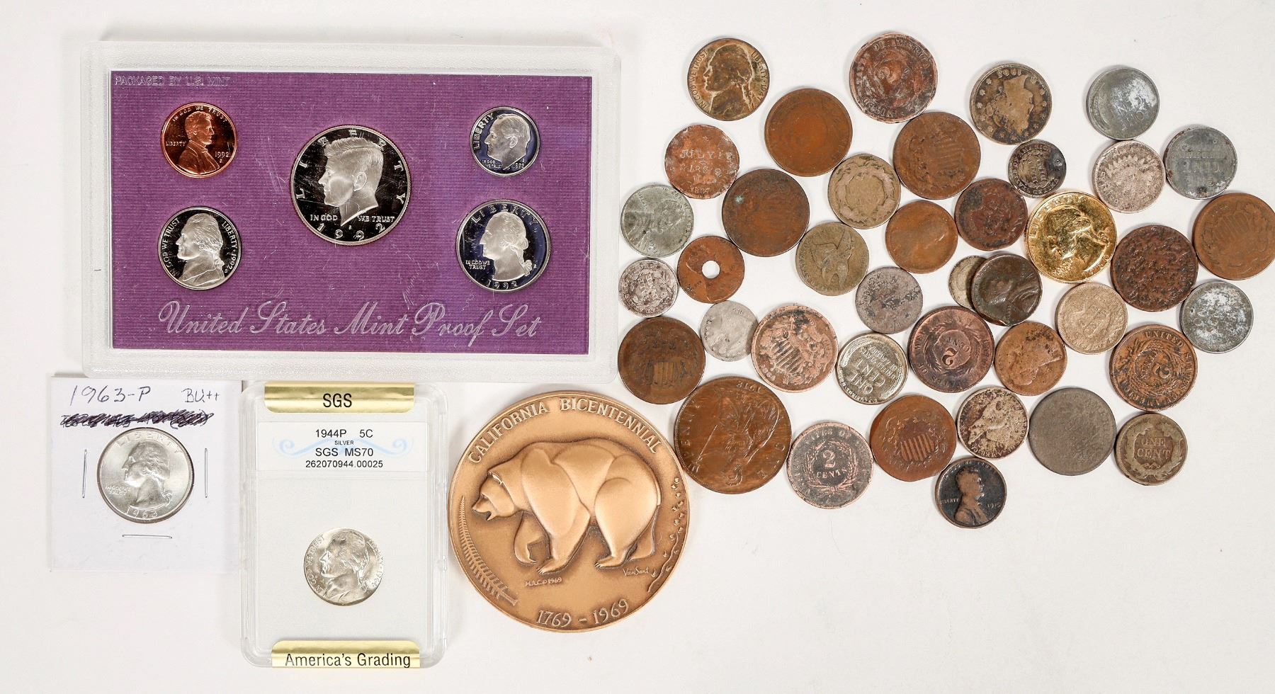 Miscellaneous group of U. S. coins: 1992 Proof Set; 1944 P MS 70 Jefferson nickel graded by SGS; 1963 BU Washington quarter; 1969 California Bicentennial bronze medal in original box with paperwork; over forty coins: half dimes, two cent pieces, Indian Head and Flying eagle cents, mostly dug.