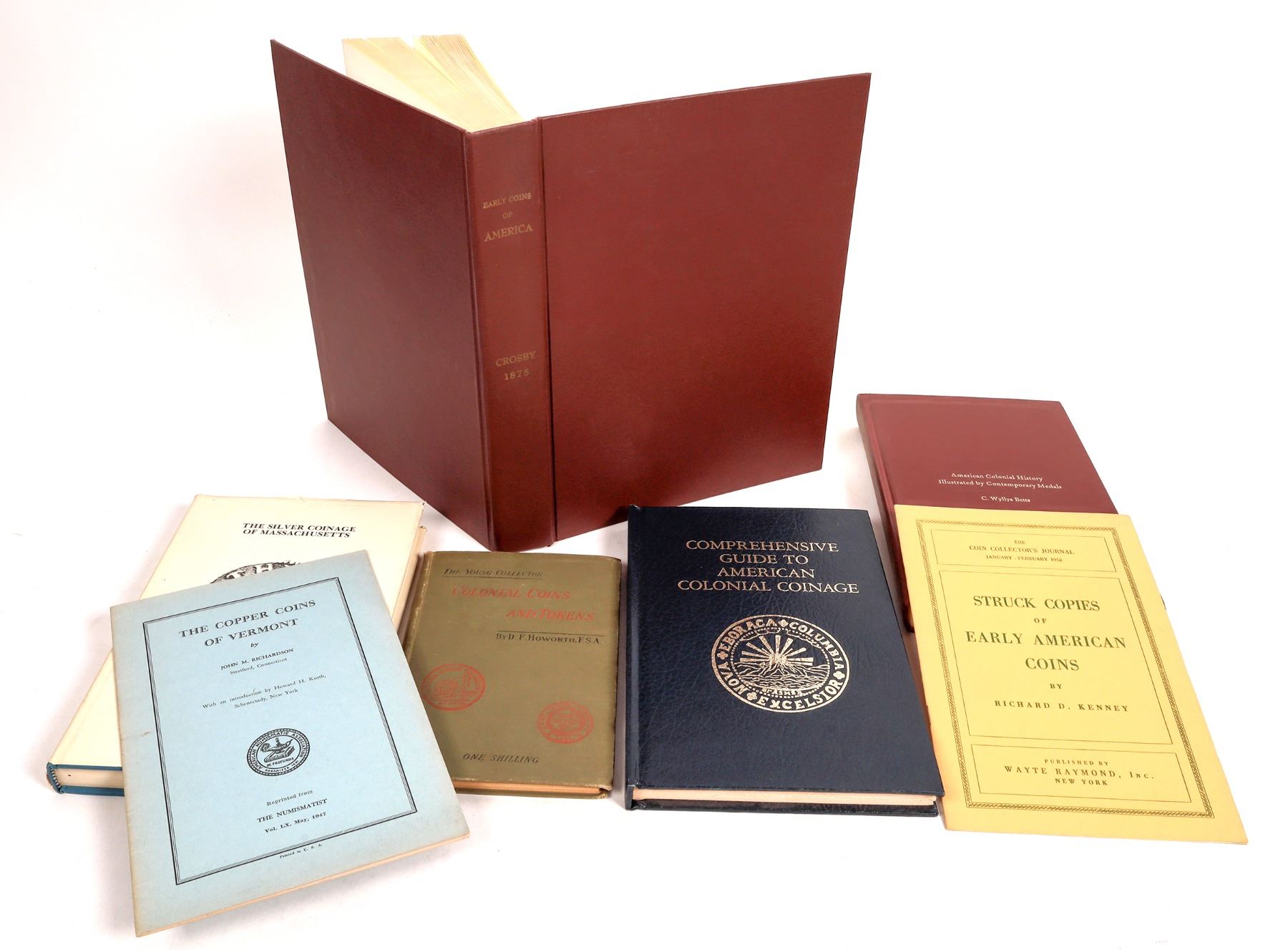 7 colonial coin references. Copper Coins of Vermont, Struck Copies of Early American Coins, Colonial Coins and Tokens, Silver Coinage of Massachusetts, Comprehensive Guide to American Colonial Coins, American Colonial History by Betts, Early Coins of America by Crosby.
