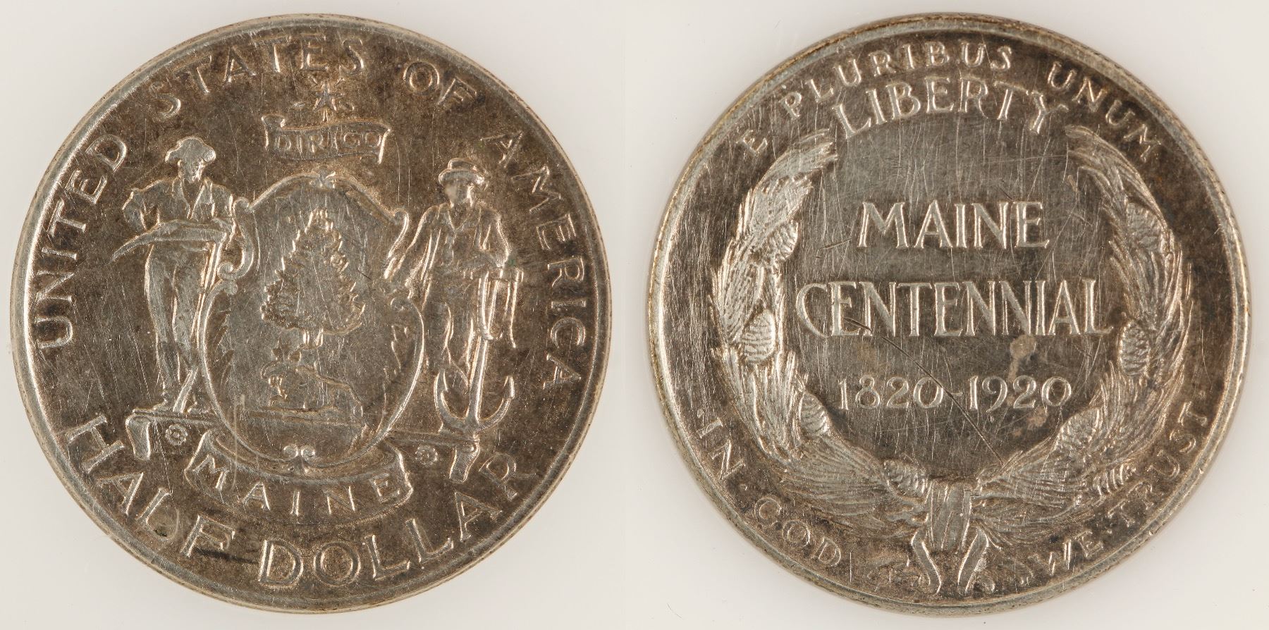 Congress authorized this coin to be sold at the Portland, Maine centennial celebration. The coins were received too late for this event and were sold by the state treasurer for many years. Anthony de Francisco modeled this coin from a design by Harry H. Cochrane. Date: 1920 City: State: HWAC# 76304