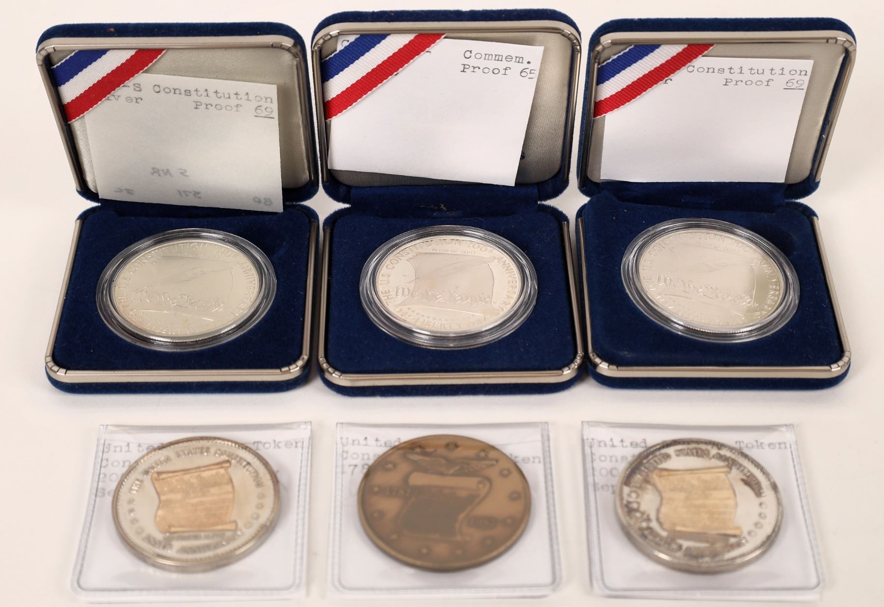Lot of six: three 1987-S United States Constitution proof silver dollars in plush blue hard shell cases. Three medals from 1987 commemorating the 200th anniversary of the Constitution.