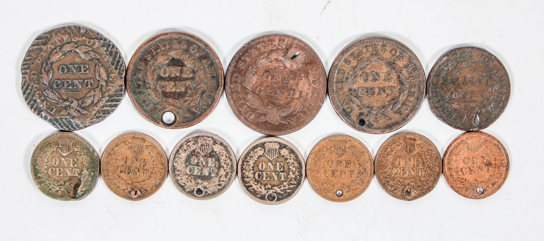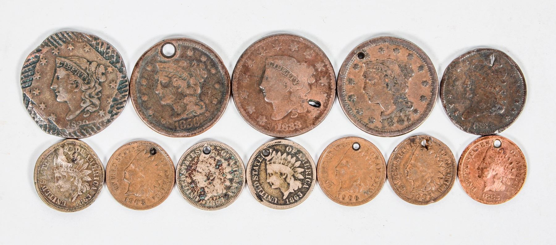 A dozen U. S. copper coins that have been holed: 1834 half cent; 1833 large cent; 1839 (?) large cent artistically enhanced; 1847 large cent; 1858 large cent; 1863 Indian Head cent (hole doesn't quite go through the whole coin); 1863 Indian head; 1864 Indian head; 1882 Indian head (polished); 1903 Indian head; 1903 Indian head; 1906 Indian head.
