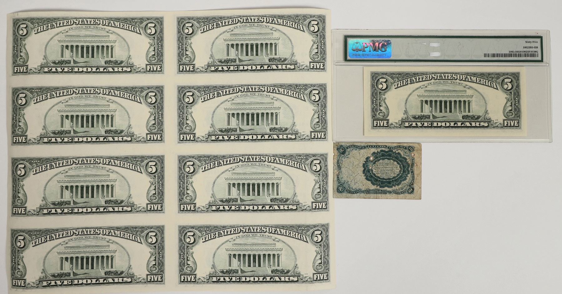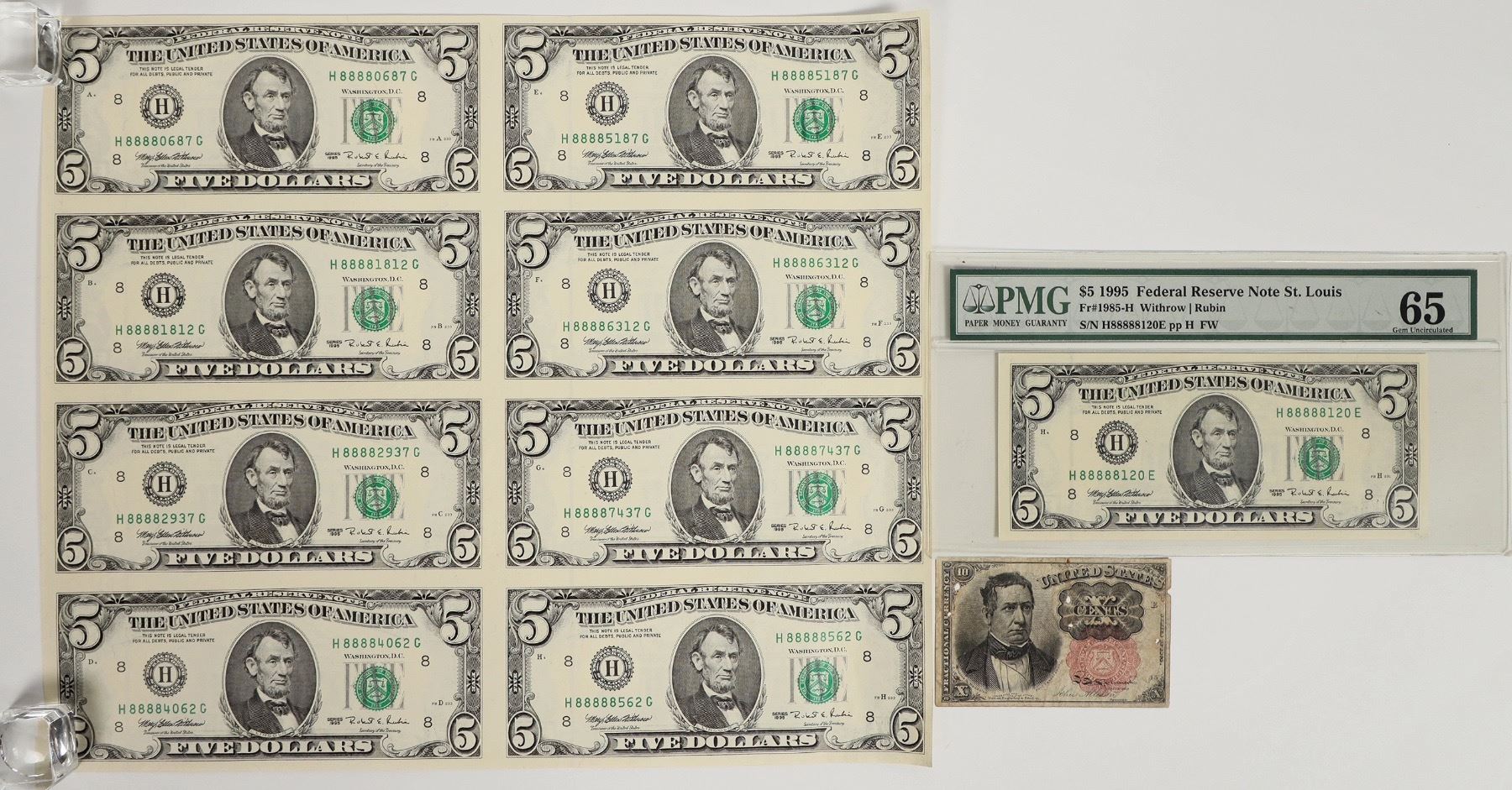 Uncut sheet of eight $5 Federal Reserve Notes Series 1995. PMG graded 65 Gem Uncirculated $5 1995 Federal Reserve Note St. Louis; Fr#1985-H Withrow/Rubin. Ten cent fractional currency 1871 William M. Meredith; G-VG condition with five pinholes.