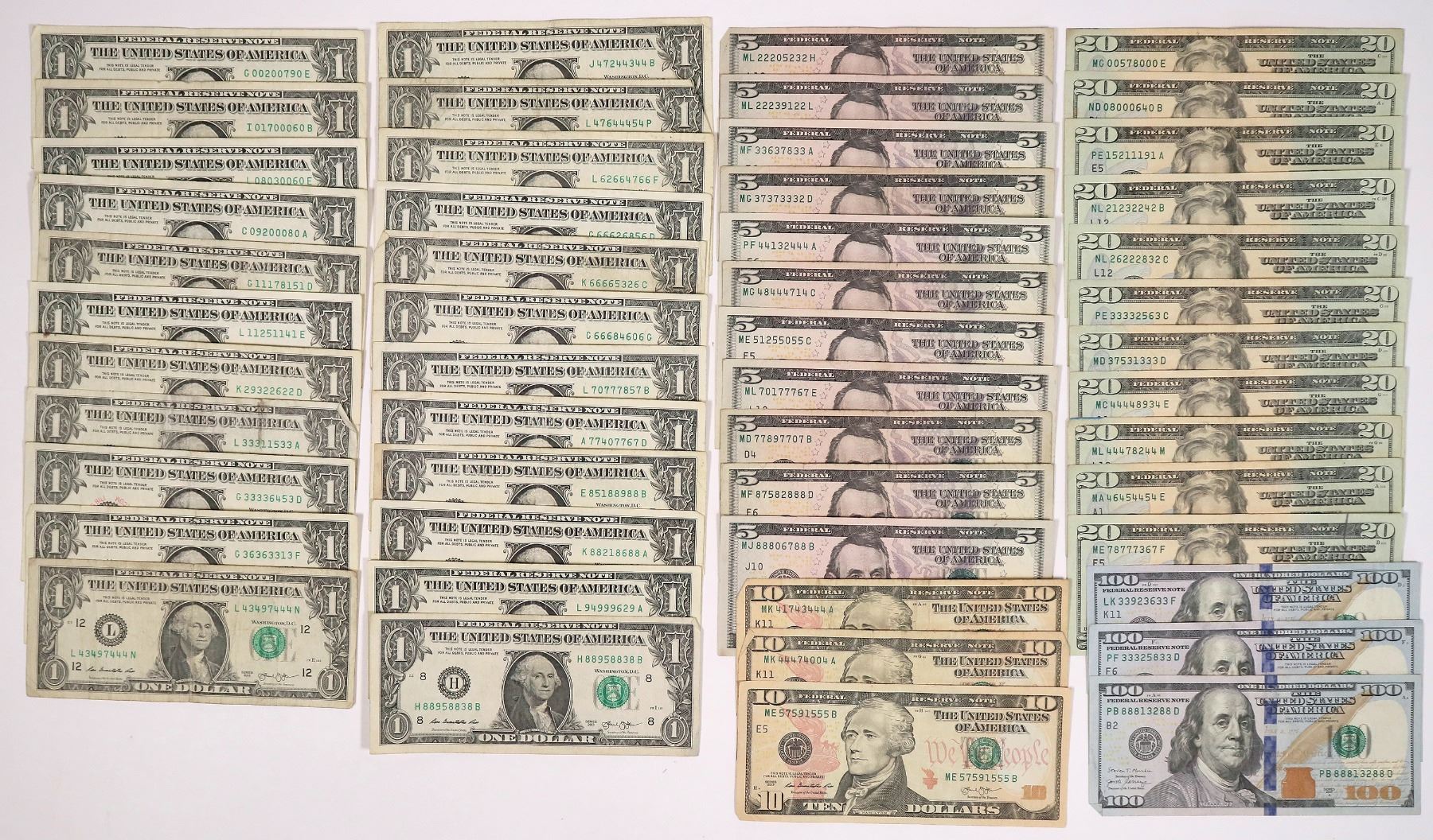 $628 face value U. S. currency notes with serial numbers with five of a kind on either end of the serial number. Three $100; eleven $20; three $10; eleven $5; twenty three $1.