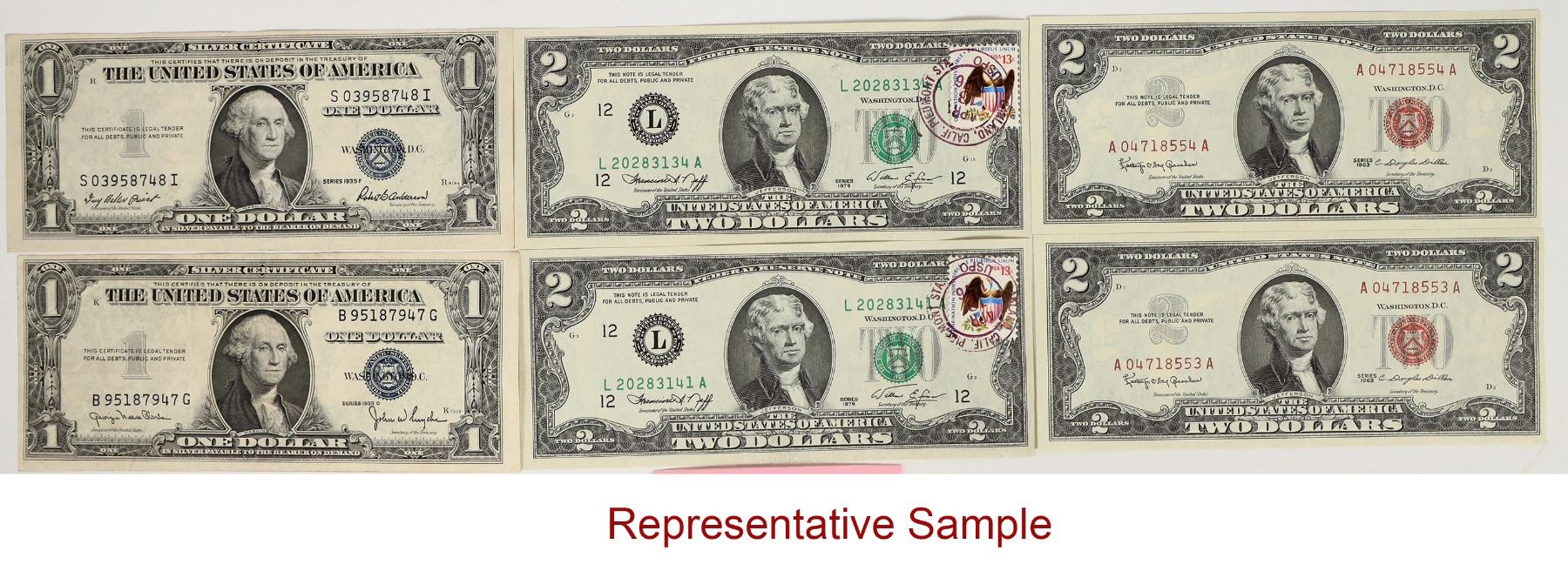Five $1 silver certificates, mostly AU condition. Twenty nine $2 bills: 18 have first day of issue stamp postmarks and are crisp uncirculated; one is star note (VG condition, damaged).