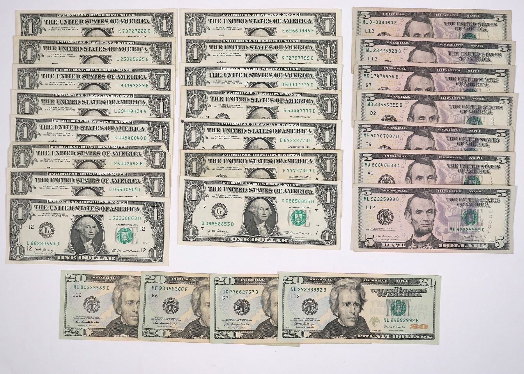 $130 face value U.S. currency with serial numbers including three or four numbers in a row, including two lucky sevens.