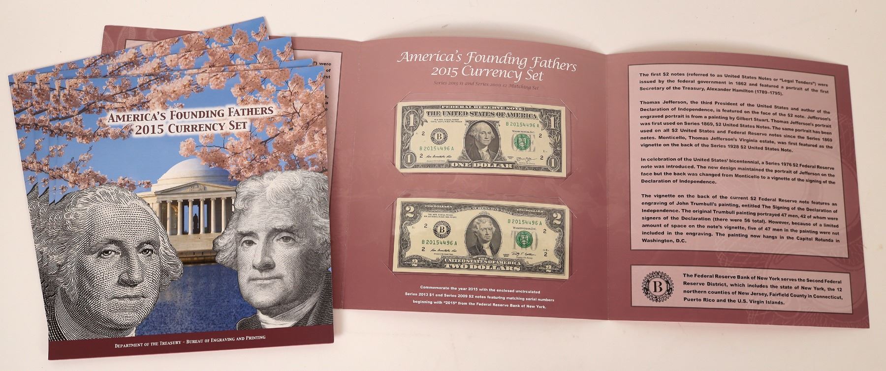 1) Five sets of America's Founding Fathers 2015 Currency Set issued by the Bureau of engraving and Printing containing a one and a two dollar bill and prose about Washington and Jefferson. 2) The Complete Collection of 20th Century One-Dollar Silver Certificates issued by Postal Commemorative Society with five silver certificates and commemorative stamps. 3) United States Commemorative Gallery uncut sheet of four $2 bills. 4) United States Commemorative Gallery "Mt. Rushmore" uncut sheet of one dollar bills with Abe, Teddy & Thomas joining George on the currency like they join each other on Mt. Rushmore.