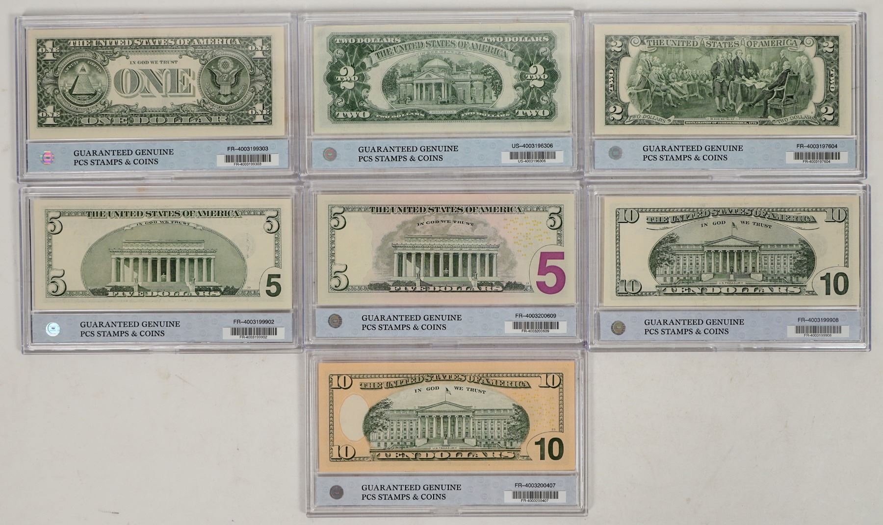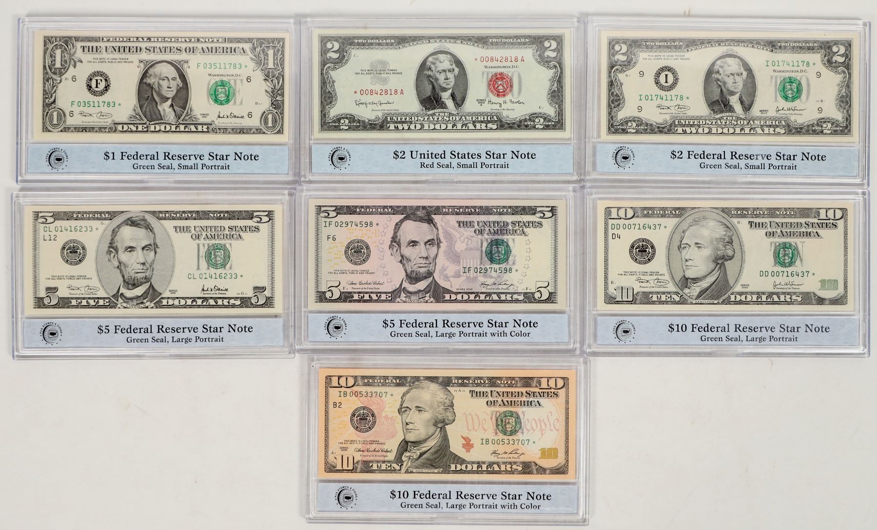 Star notes are replacement notes with a star next to the serial number. Seven crisp uncirculated star notes issued by PCS Stamps & Coins in hard plastic cases: 2001 $1; 1963A $2 United States Note; 2003 $2 Federal Reserve Note; 2001 $5 Federal Reserve Note; 2006 $5 Federal Reserve Note; 2006 $10 Federal Reserve Note; 2003 $10 Federal Reserve Note.