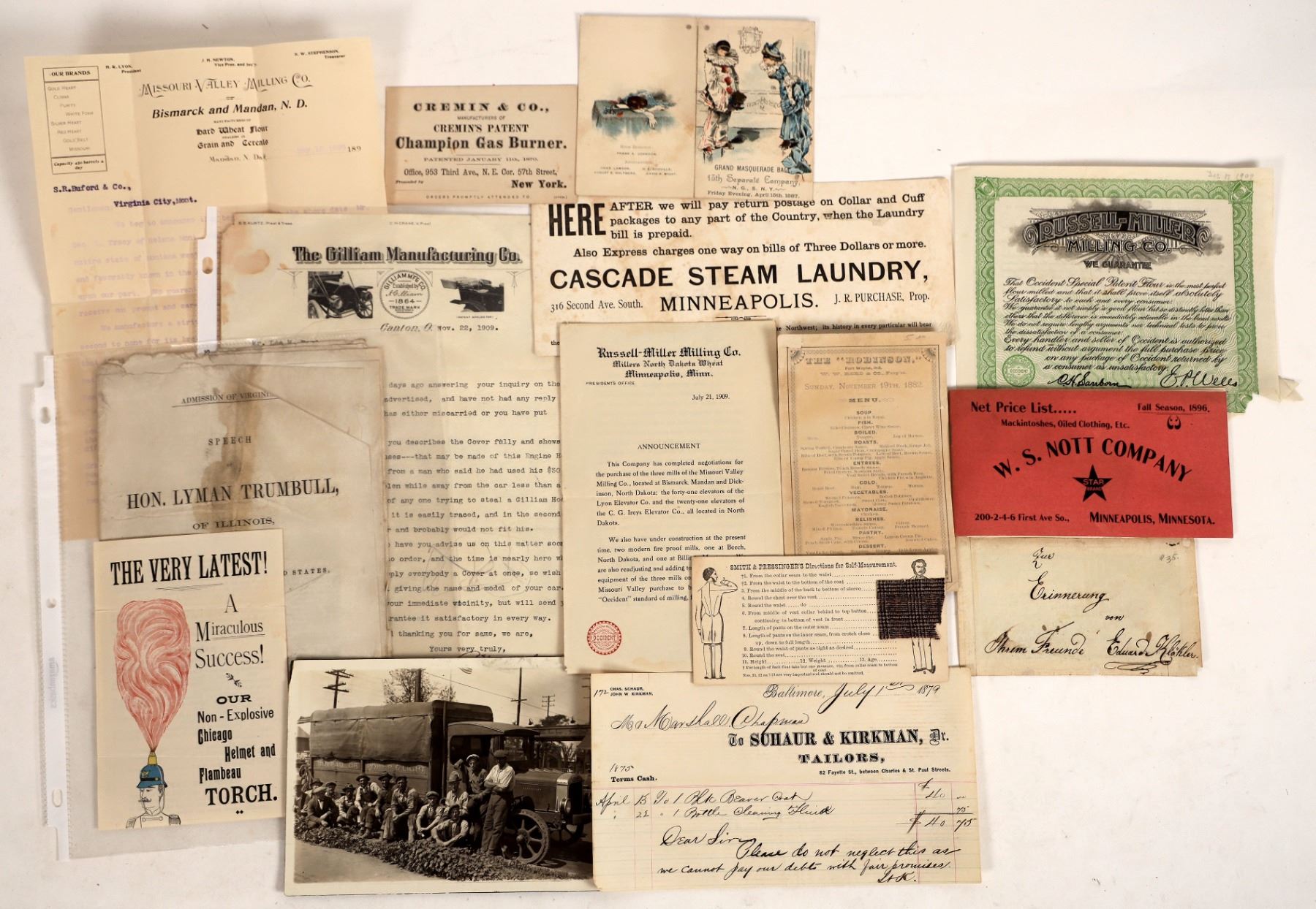 1896 W S Nott ladies garment catalog, 5x7" workers and truck photo, several tradecards, 1899 Missouri Valley Milling letterhead, billhead, 1909 milling announcement, Flambeau Torch color advertisement, 1909 pictorial Gilliam Manufacturing letter head-left edge damage and stain, 1870 Lyman Trumbell of Illinois admission of Virginia speech-stain and creases.