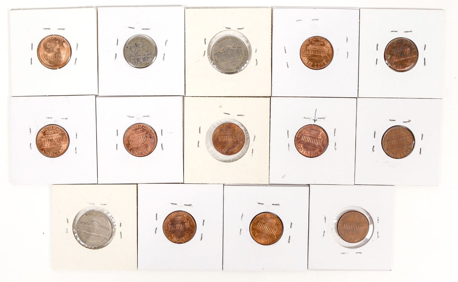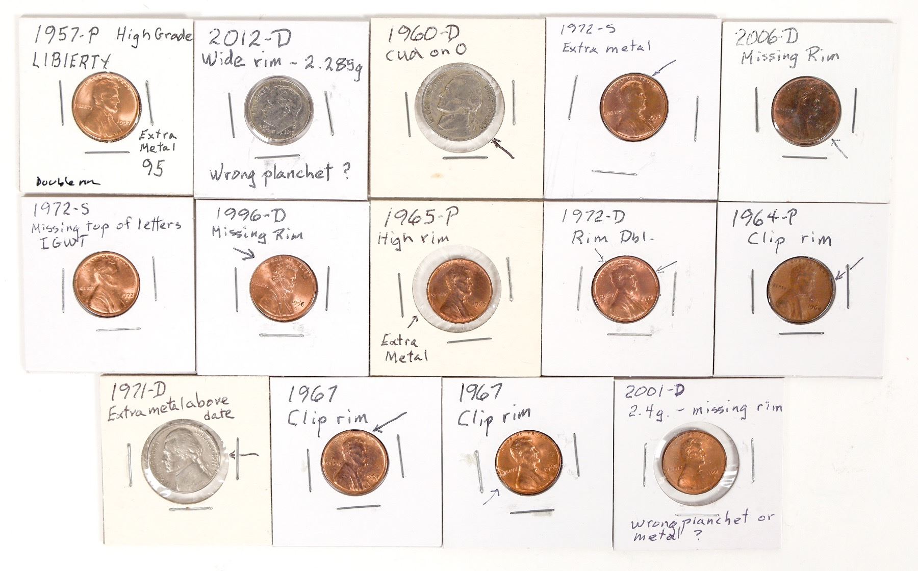 Fourteen coins with minor errors: Eleven Lincoln cents from 1957-2006. Clipped rims, missing rim; Two Jefferson nickels with extra metal splotched places; Roosevelt dime with a wide rim, possible wrong planchet (2012-D).